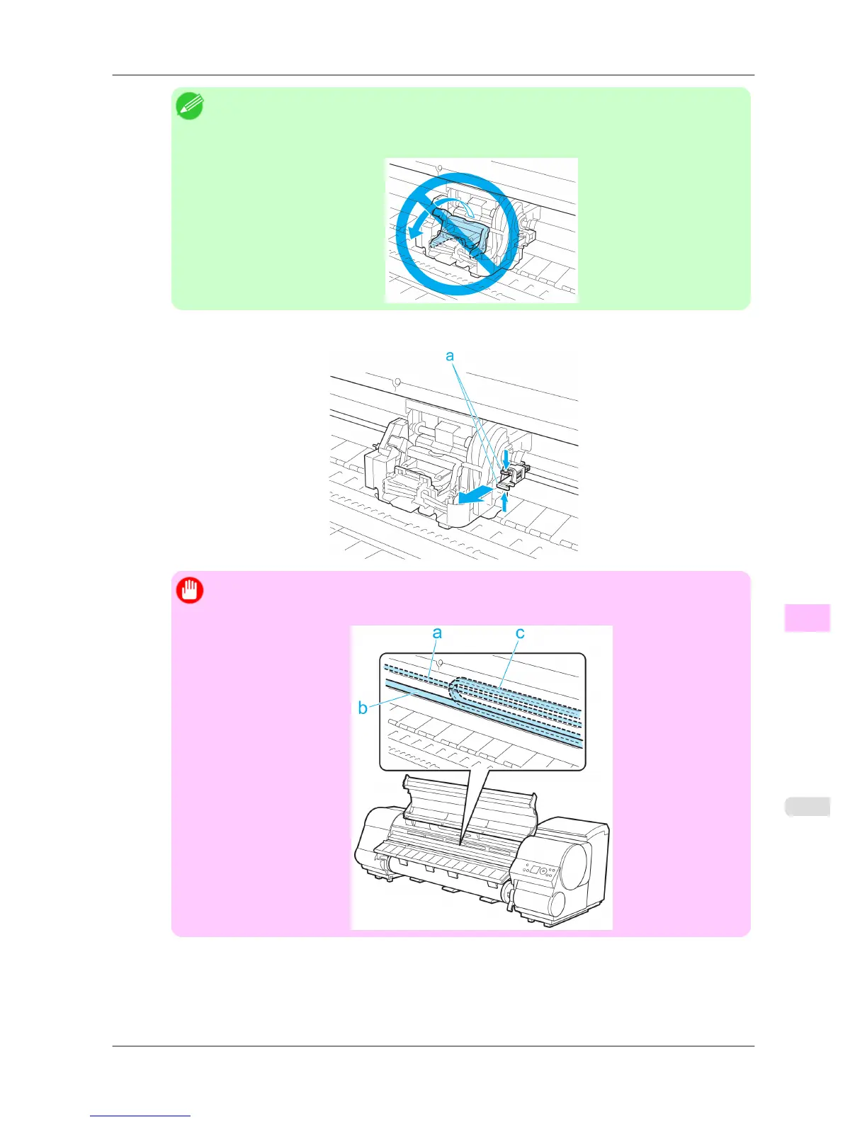 not touch the Linear Scale (a), Carriage Shaft (b), or Ink Tube Stabilizer (c). Touching these