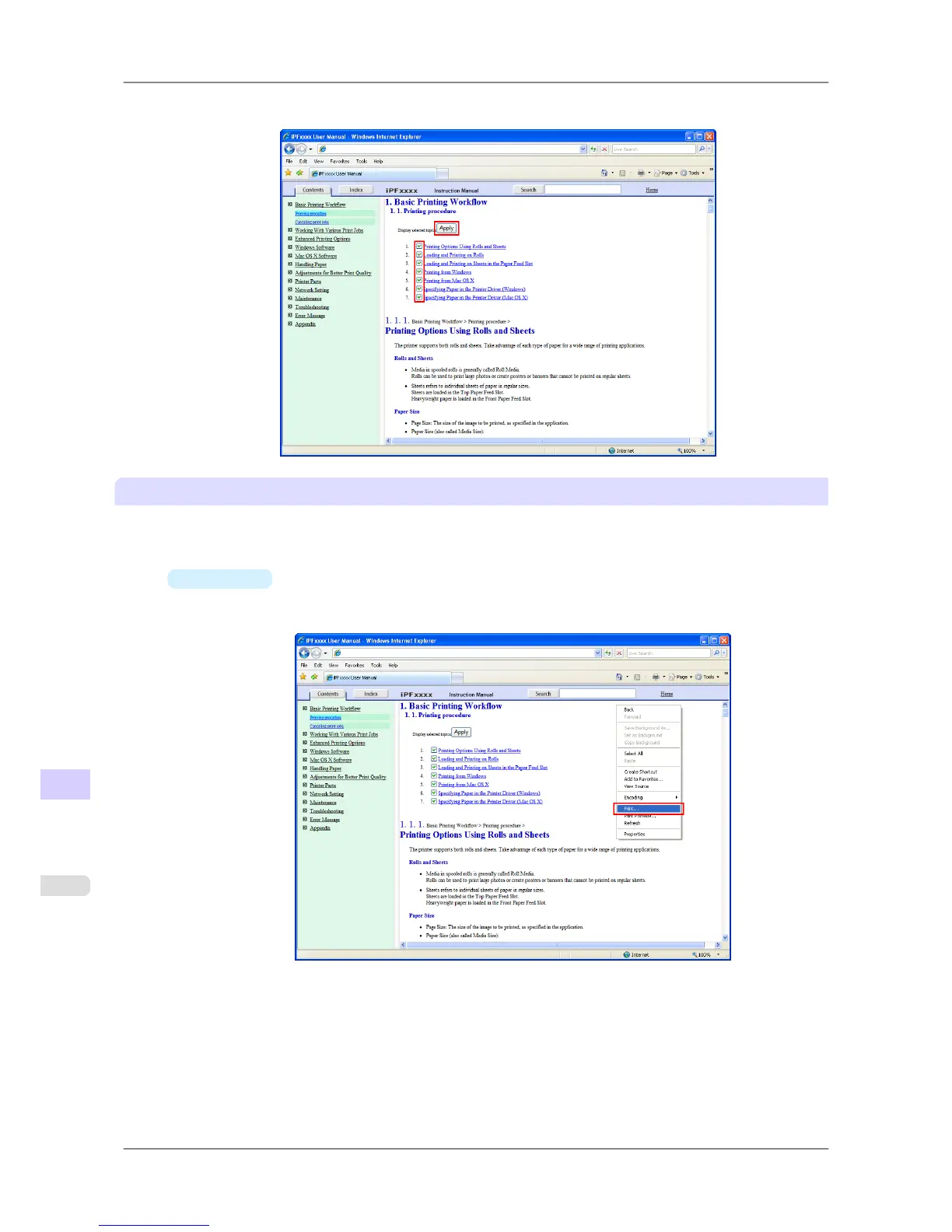 In Windows, right-click anywhere in the explanation area except on a figure or a link.In the shortcut menu,