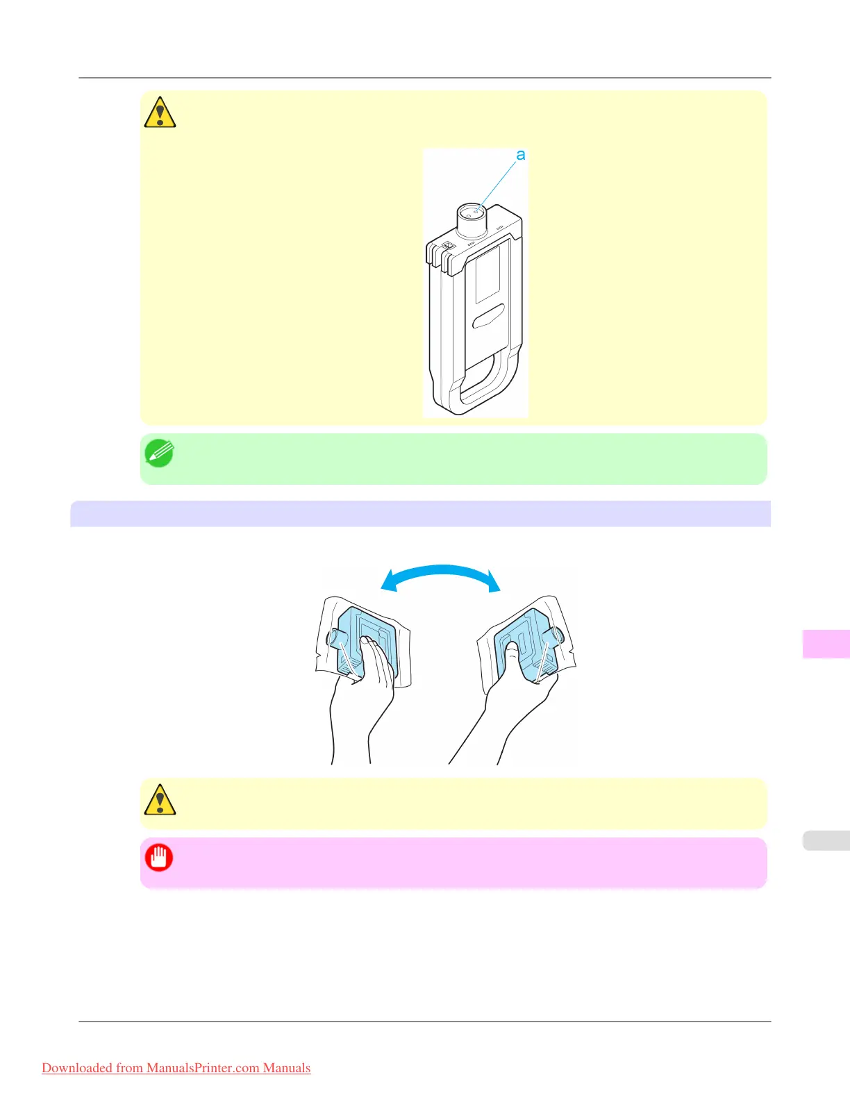 • Do not remove and agitate ink tanks that have already been installed in the printer. Ink may leak out.