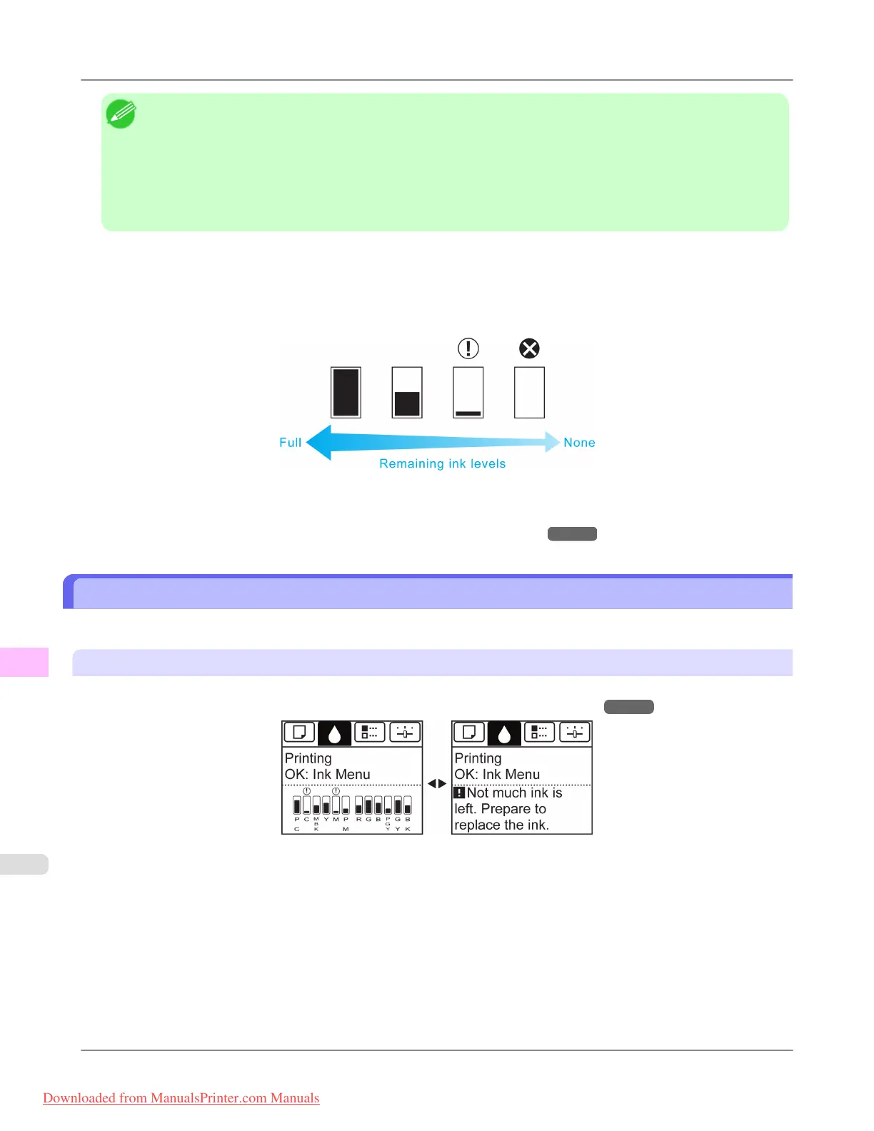These symbols may be displayed above the ink level: ! if ink is low, × if no ink is left, and ? if you have deactivated ink