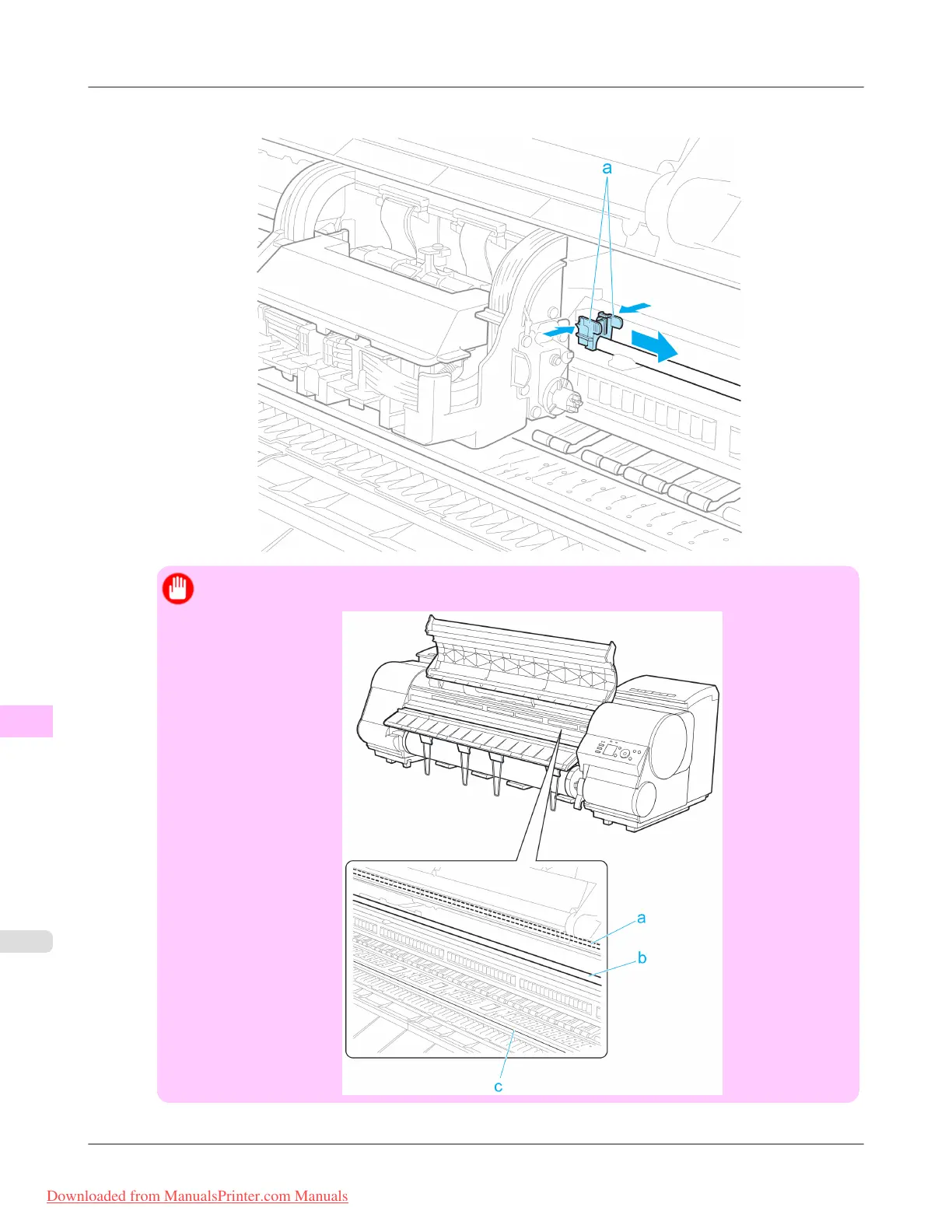 Do not touch the Linear Scale (a), Carriage Shaft (b), or Fixed Blade (c).