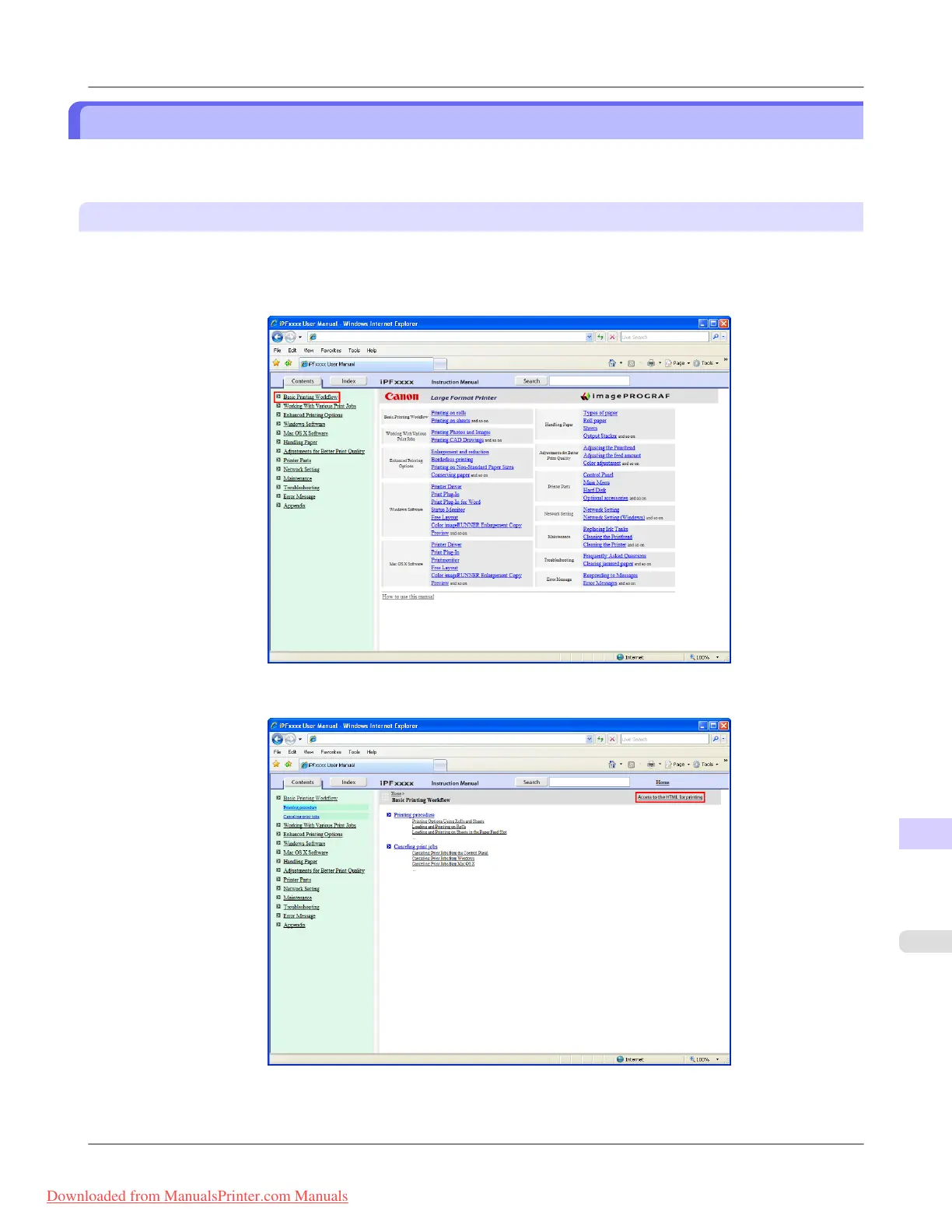 1. Click a section title in the table of contents. Here, Basic Printing Workflow is used as an example.