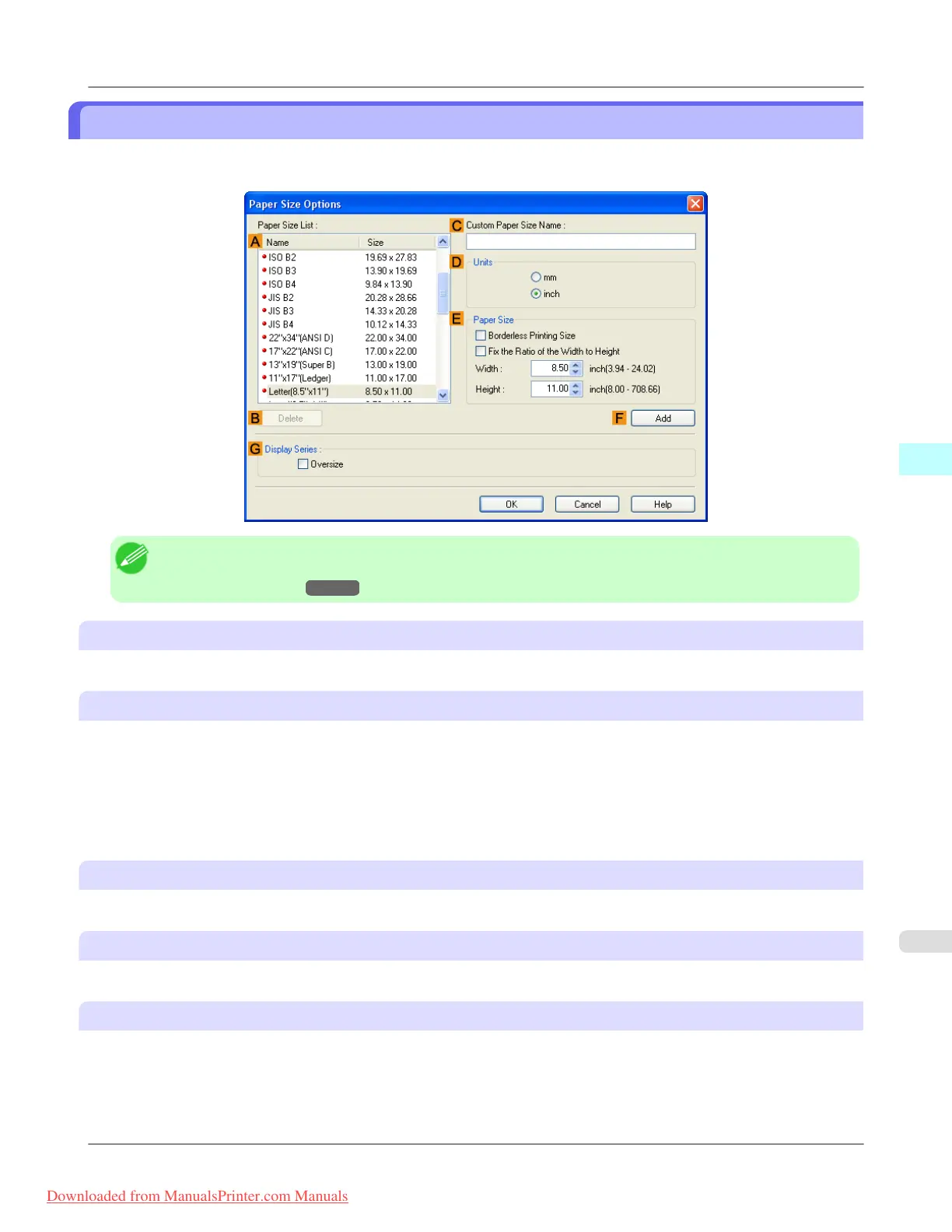 In the Paper Size Options dialog box, you can create and register your own Custom Paper Size. The sizes you define are