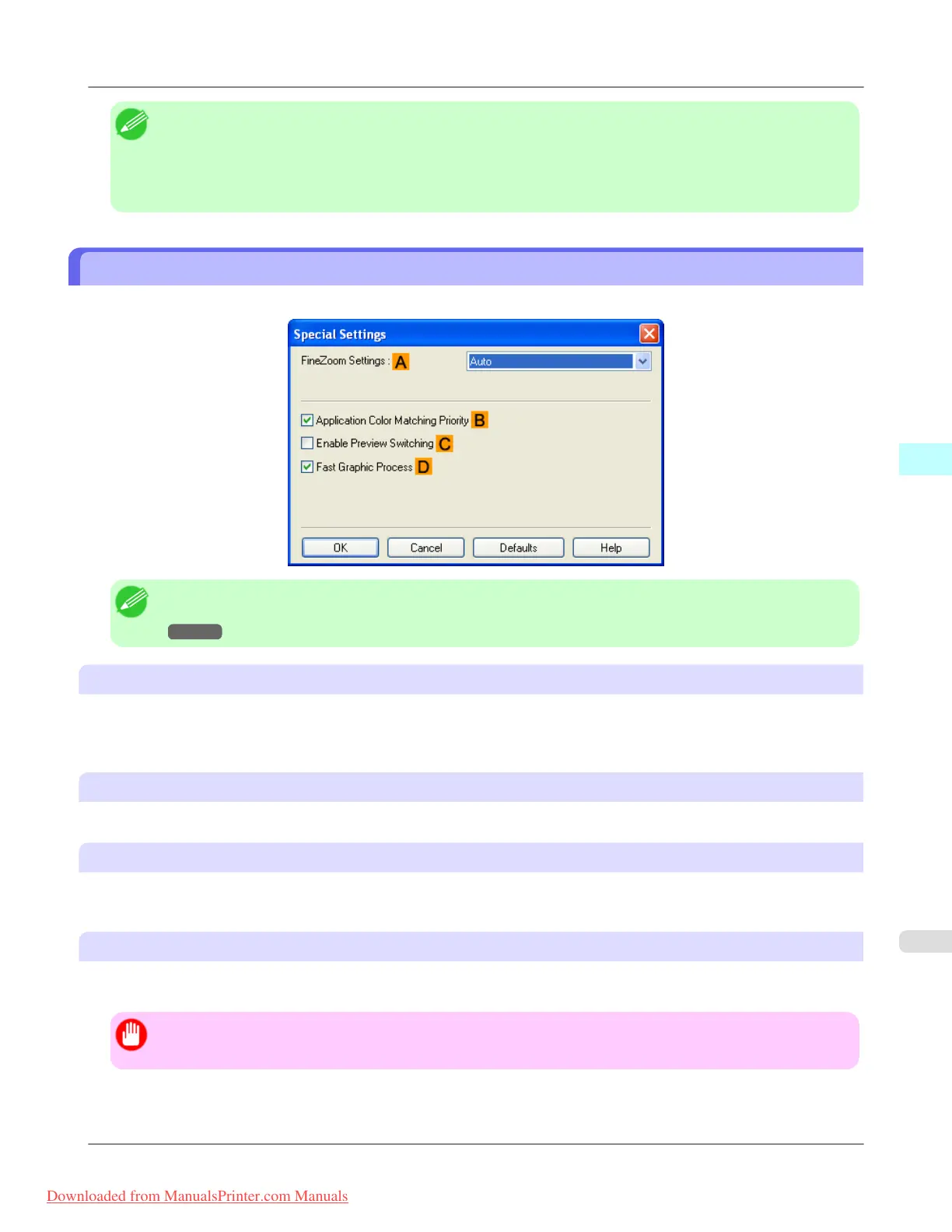If the printing results are not as you expected, you can change how printing is processed in the Special Settings dialog box.