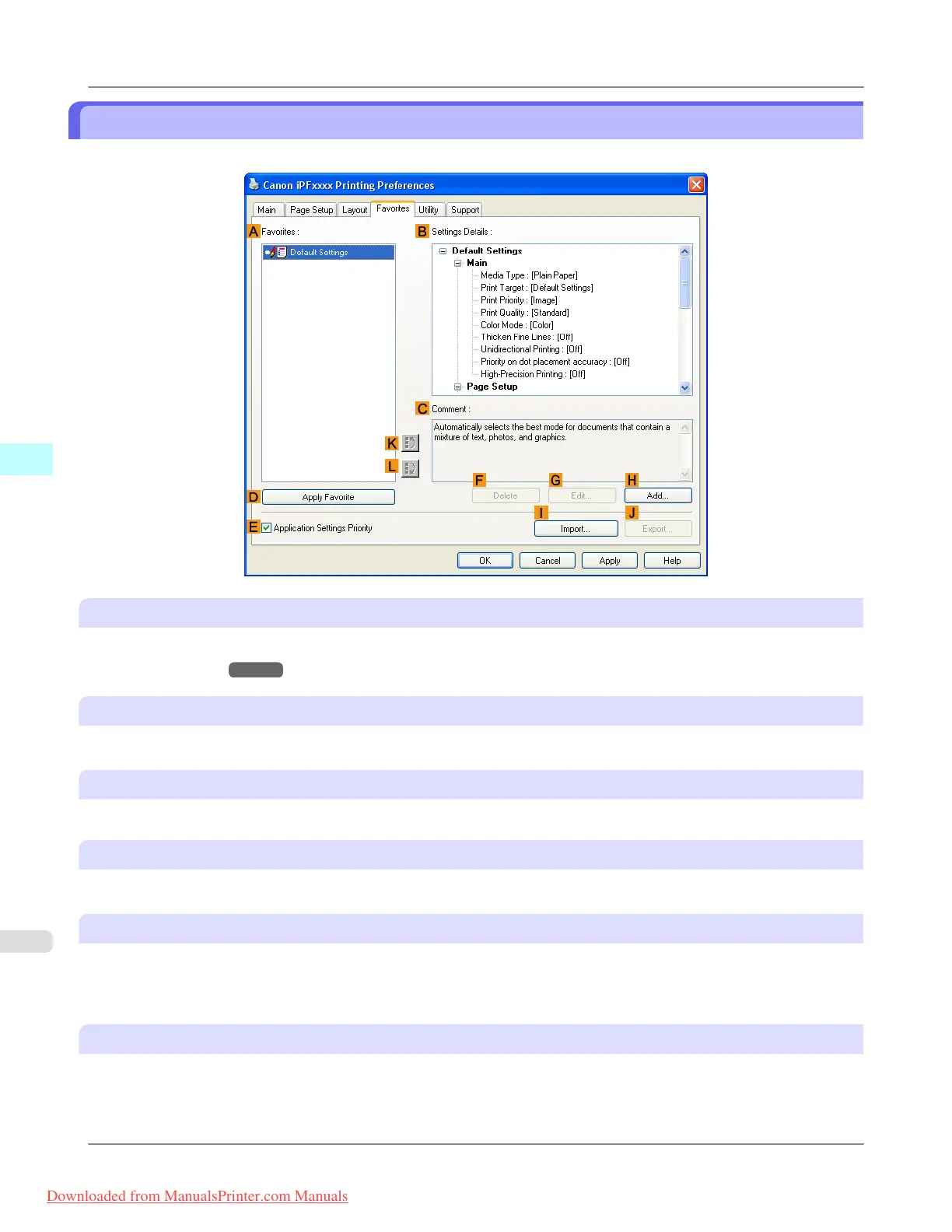 A Favorites, when clicking D Apply Favorite. For details on the settings items used in preference, refer to the printer driv-