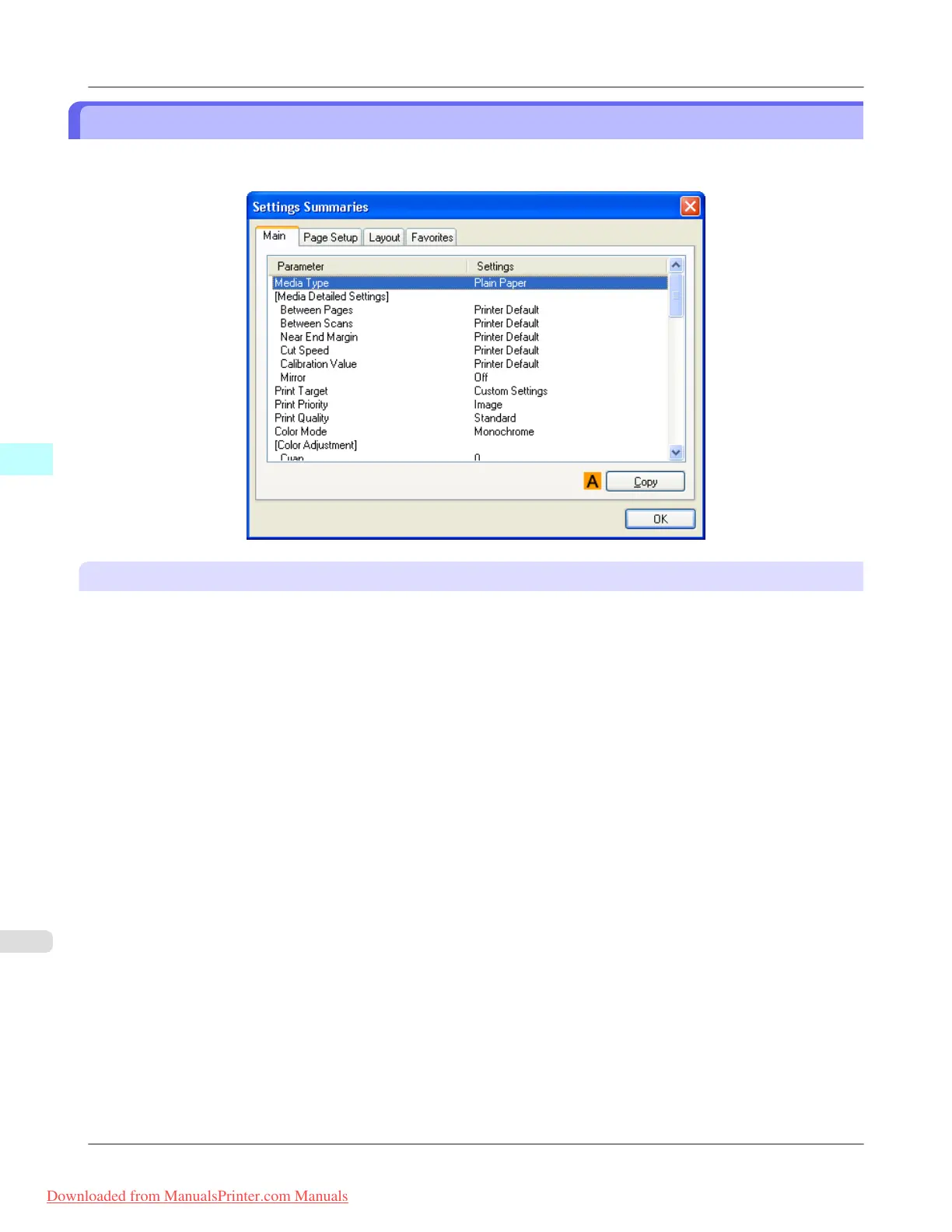 The Settings Summaries dialog box enables you to confirm the settings for the Main, Page Setup, Layout, and Favorites