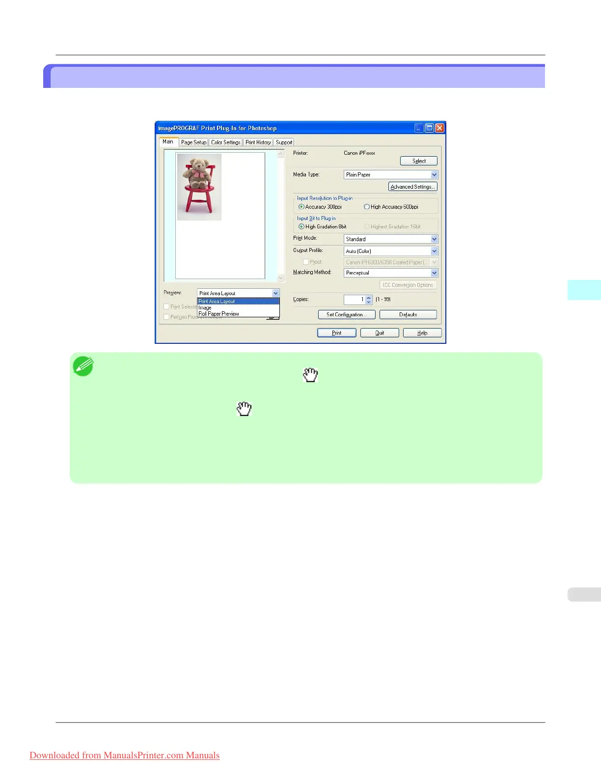 Displays the print range and the area out of the print range in the layout matching the media size set in the print area layout.