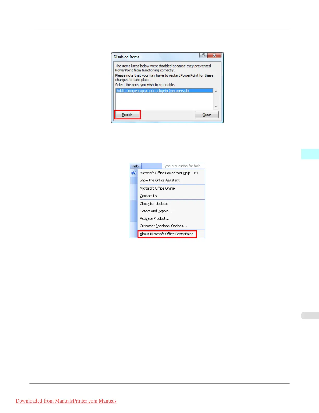 4. If Addin imageprograf print plug-in (mscoree.dll) is displayed in the Disabled Items dialog box, select it and