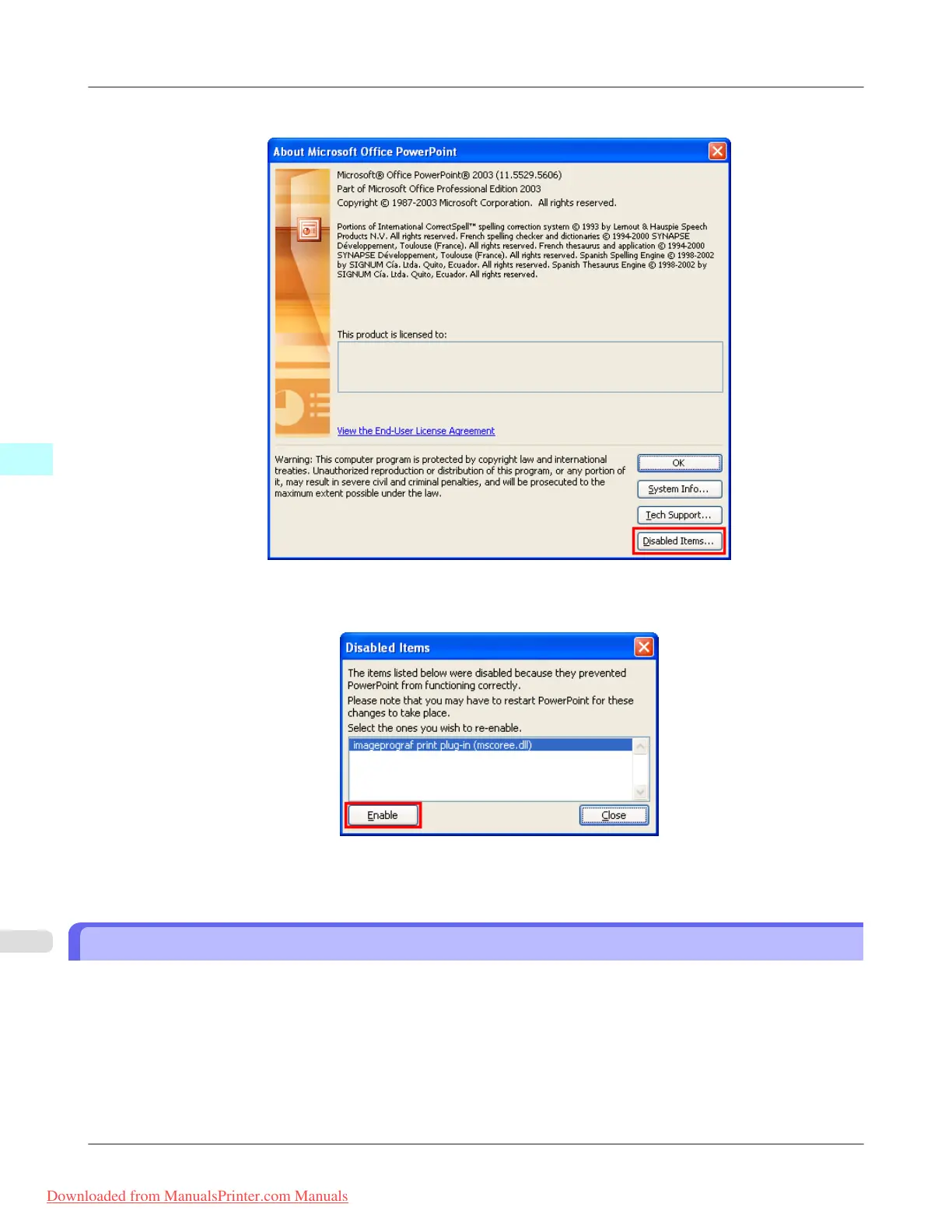 3. If Addin imageprograf print plug-in (mscoree.dll) is displayed in the Disabled Items dialog box, select it and