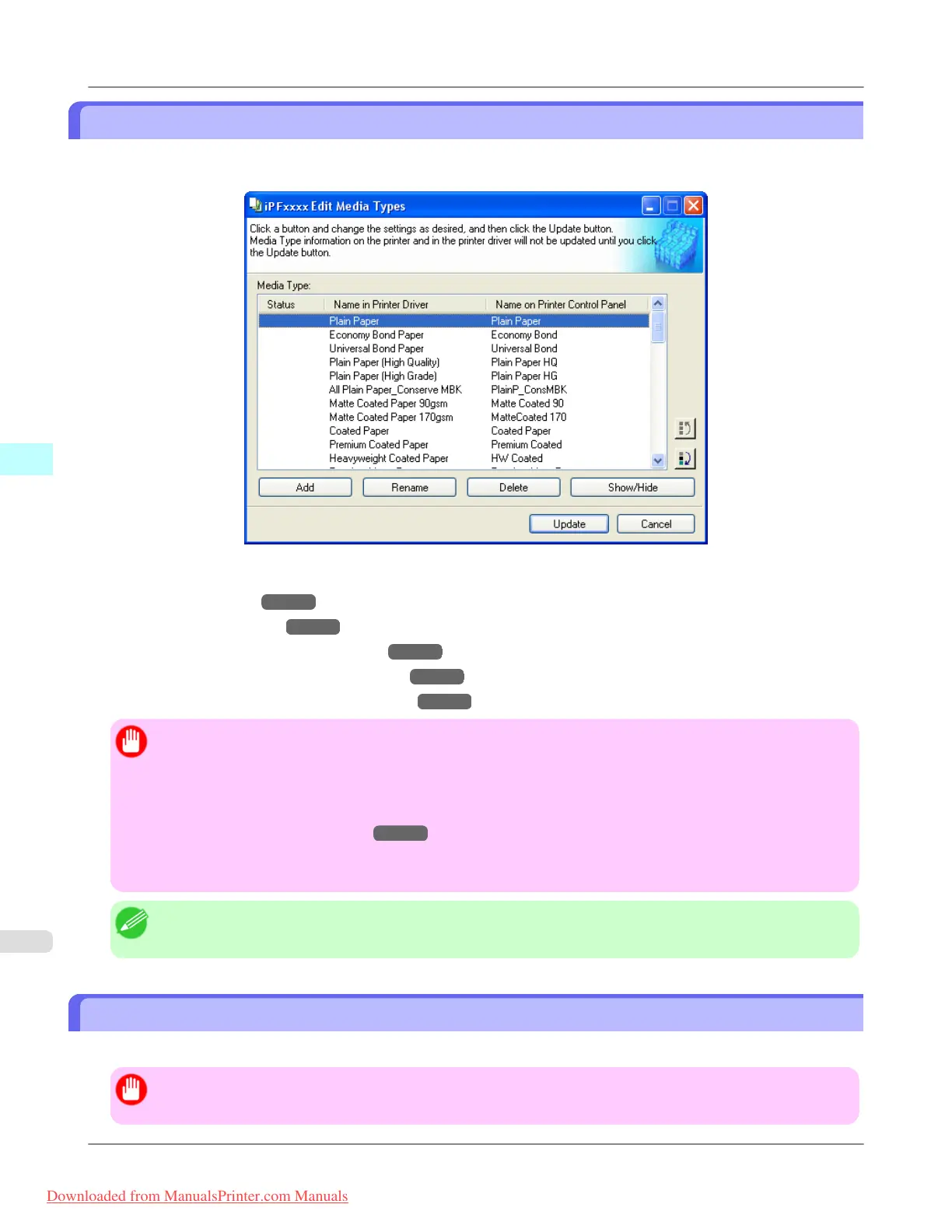 • Adding, deleting, toggling display/non-display, and changing the paper name of a media type can only be