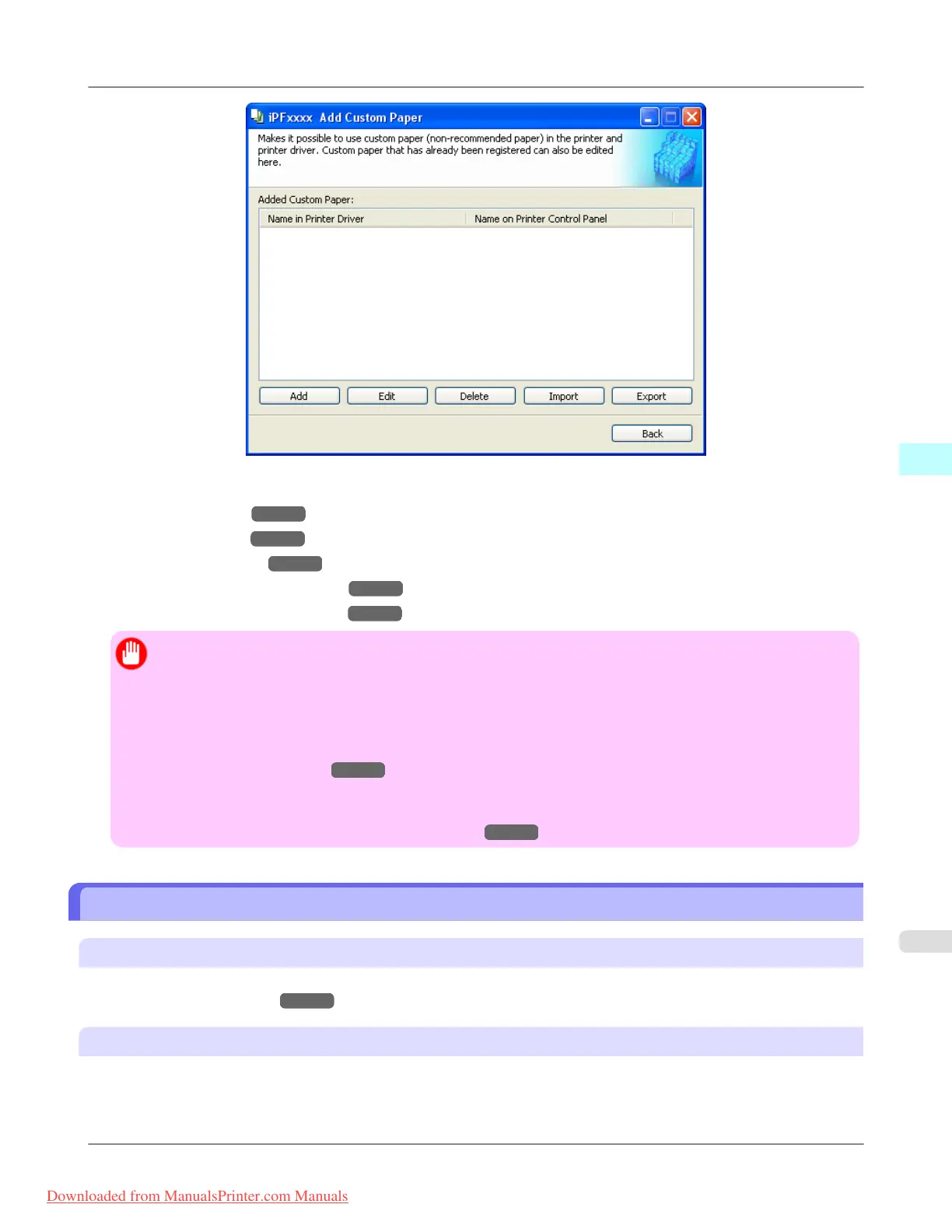 • When using custom paper in another printer, always add the custom paper to that printer before use.