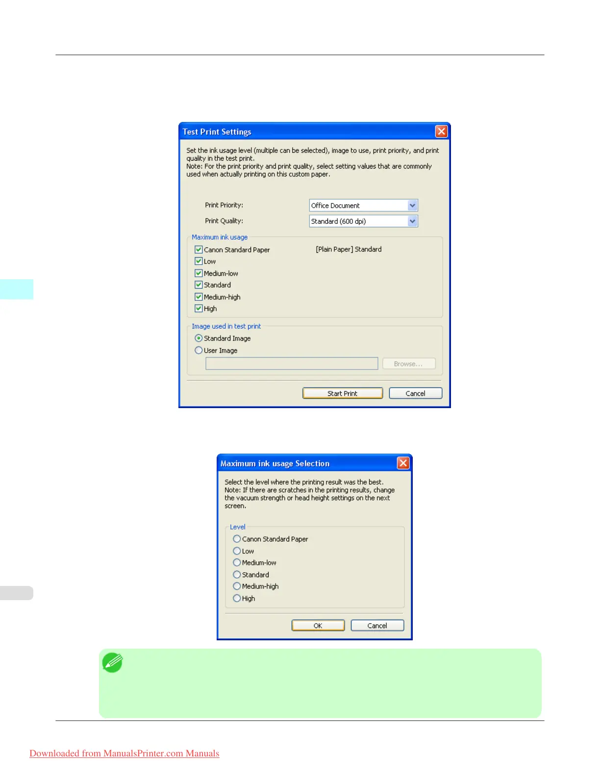Set the level to test print using Maximum ink usage and the image to use using Image used in test print, and then