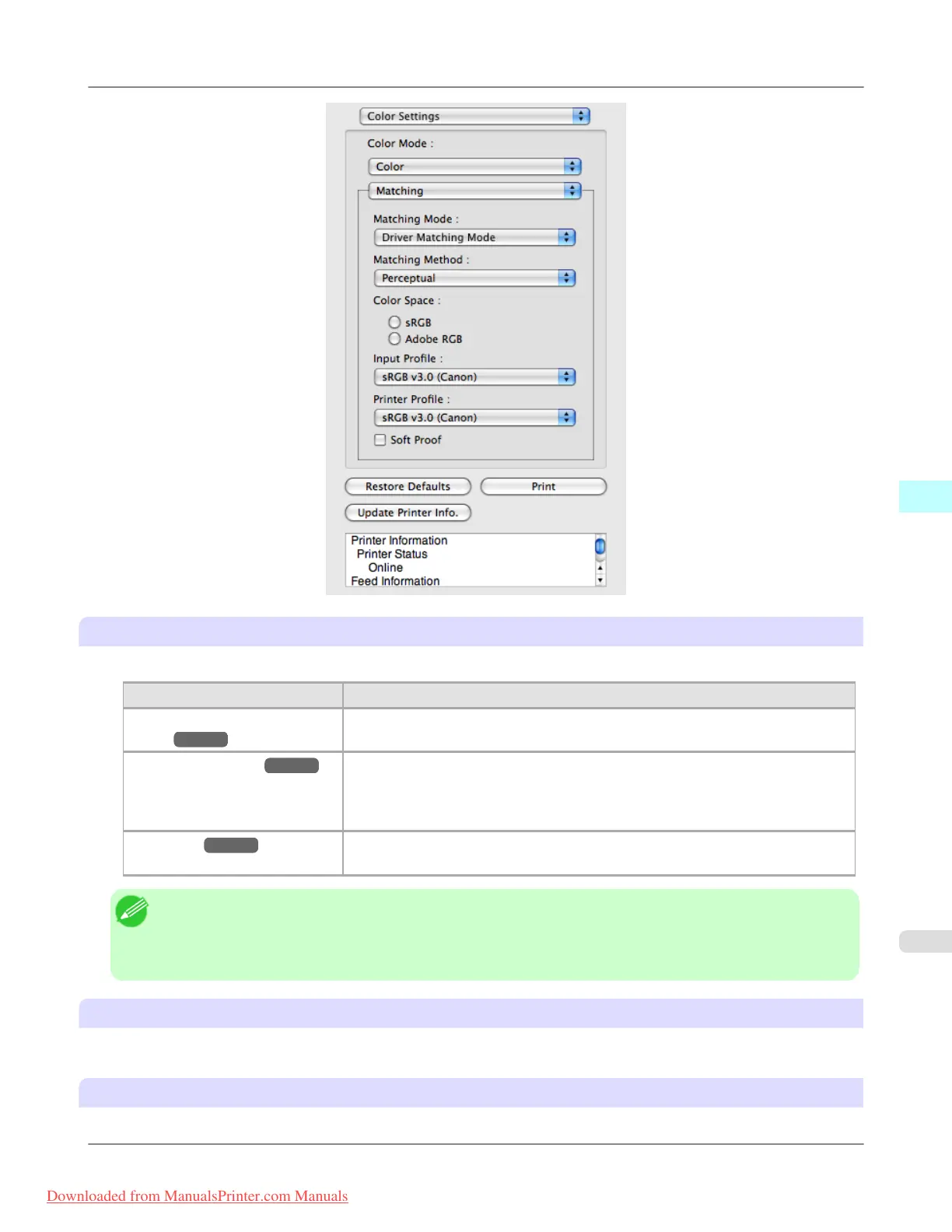 • Using Mac OS X 10.5 or later, ColorSync needs to be selected in the Color Matching panel of the driver in