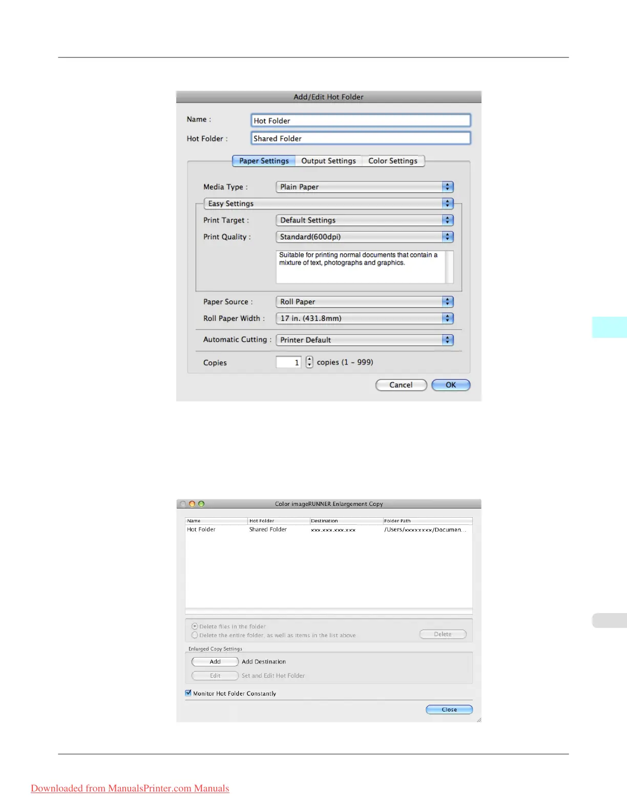 7. Click the OK button. The created Hot Folder is listed in the Color imageRUNNER Enlargement Copy dialog box.