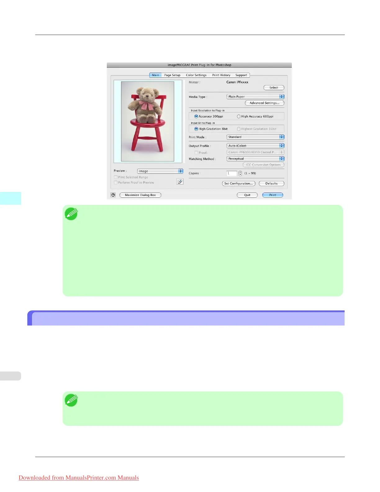 The imagePROGRAF Print Plug-In for Photoshop window (known below as the Print Plug-In window) is displayed.