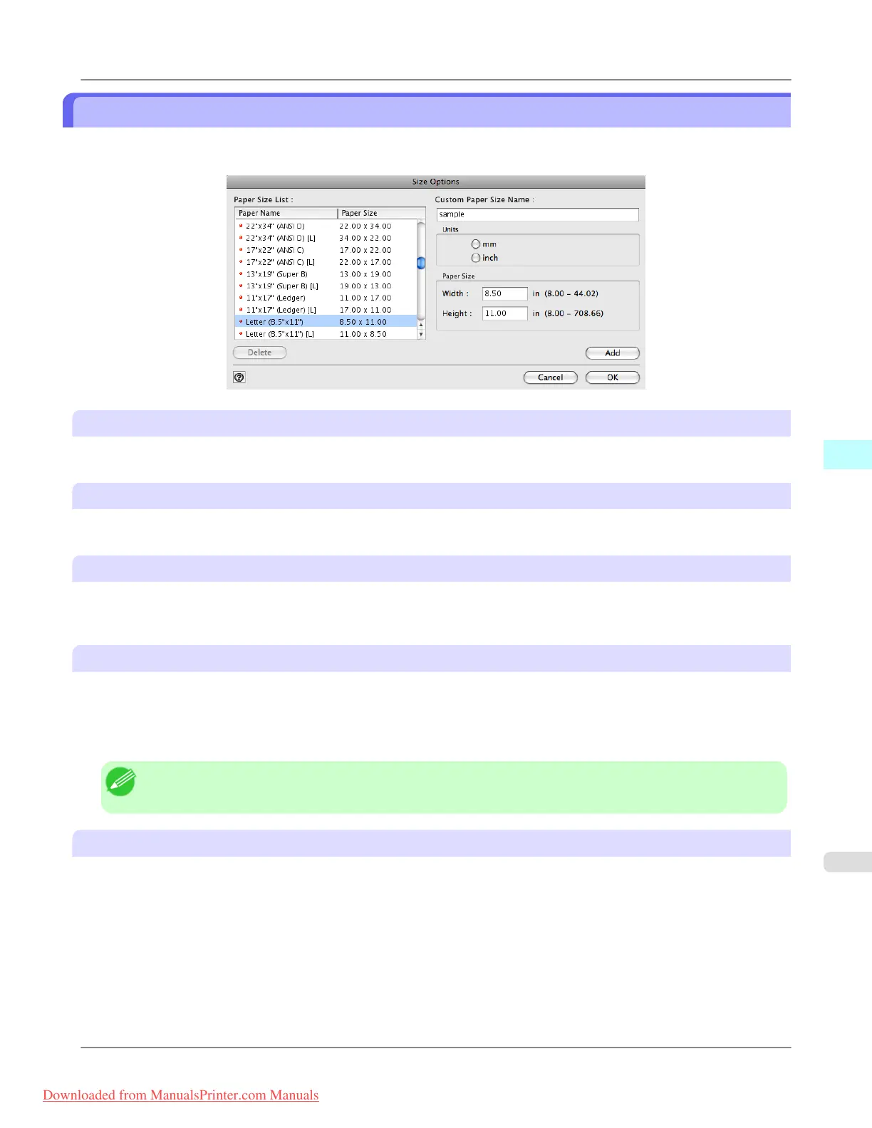 This dialog box appears when you click the Size Options button on the Page Setup Sheet. You can select a media name,