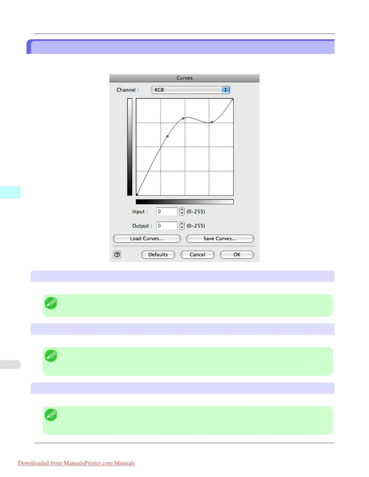 This dialog box appears when you click the Curves button on the Color Settings Sheet. You can set Channel and other