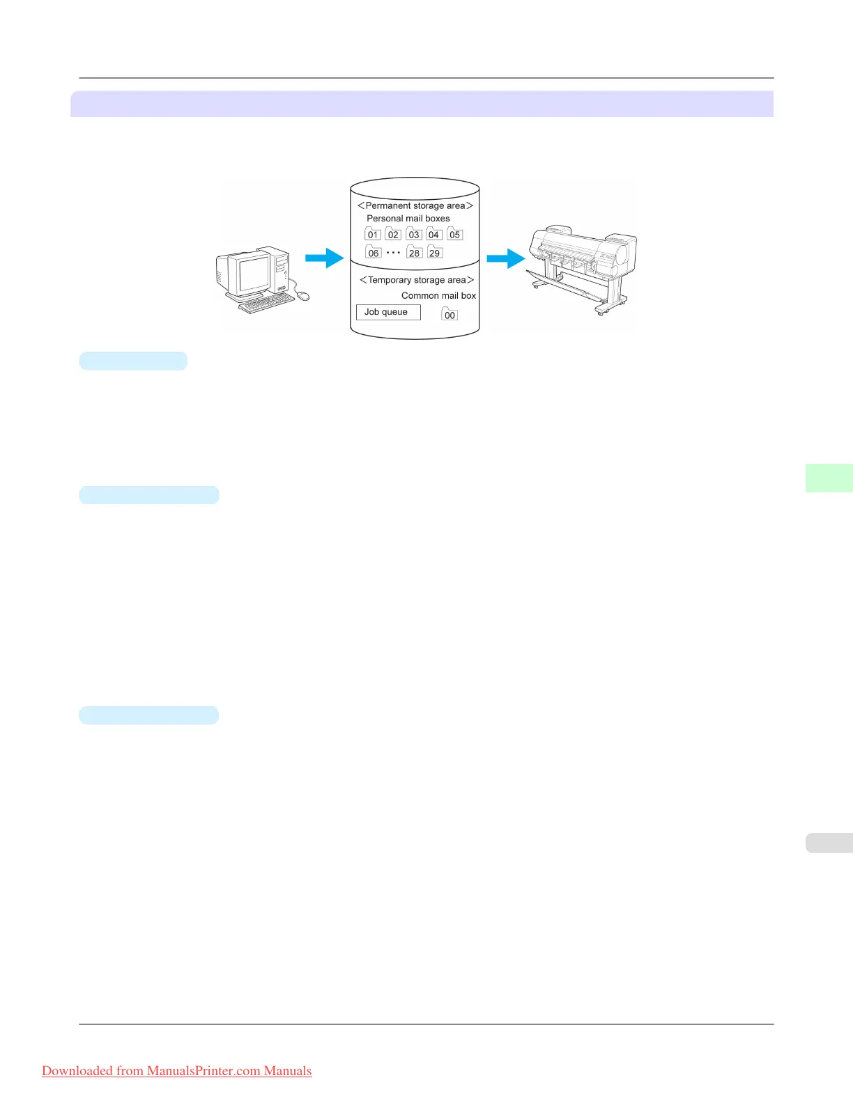 porary storage area stores print jobs in the job queue or shared mailbox. The permanent storage area stores jobs in personal
