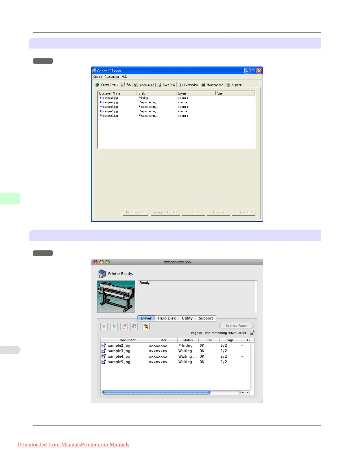 Manage jobs as needed on the Driver sheet. For details, see "Job Management Using imagePROGRAF Printmonitor."