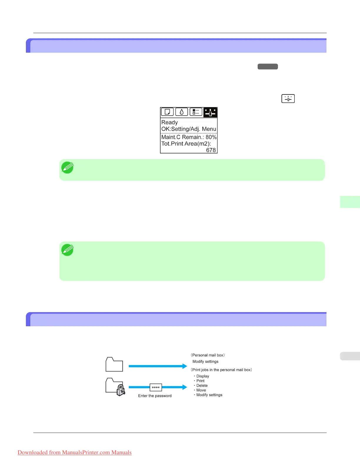 the personal box settings, as well as to display, print, delete, move, and modify jobs saved in the personal box.