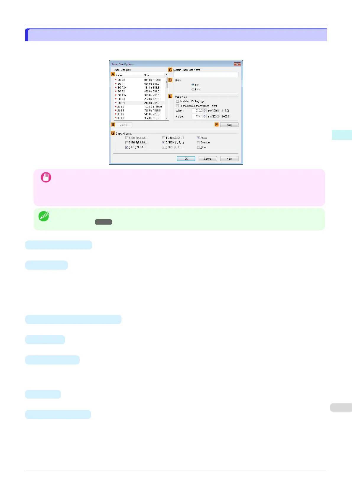 In the Paper Size Options dialog box, you can create and register your own Custom Paper Size. The sizes you