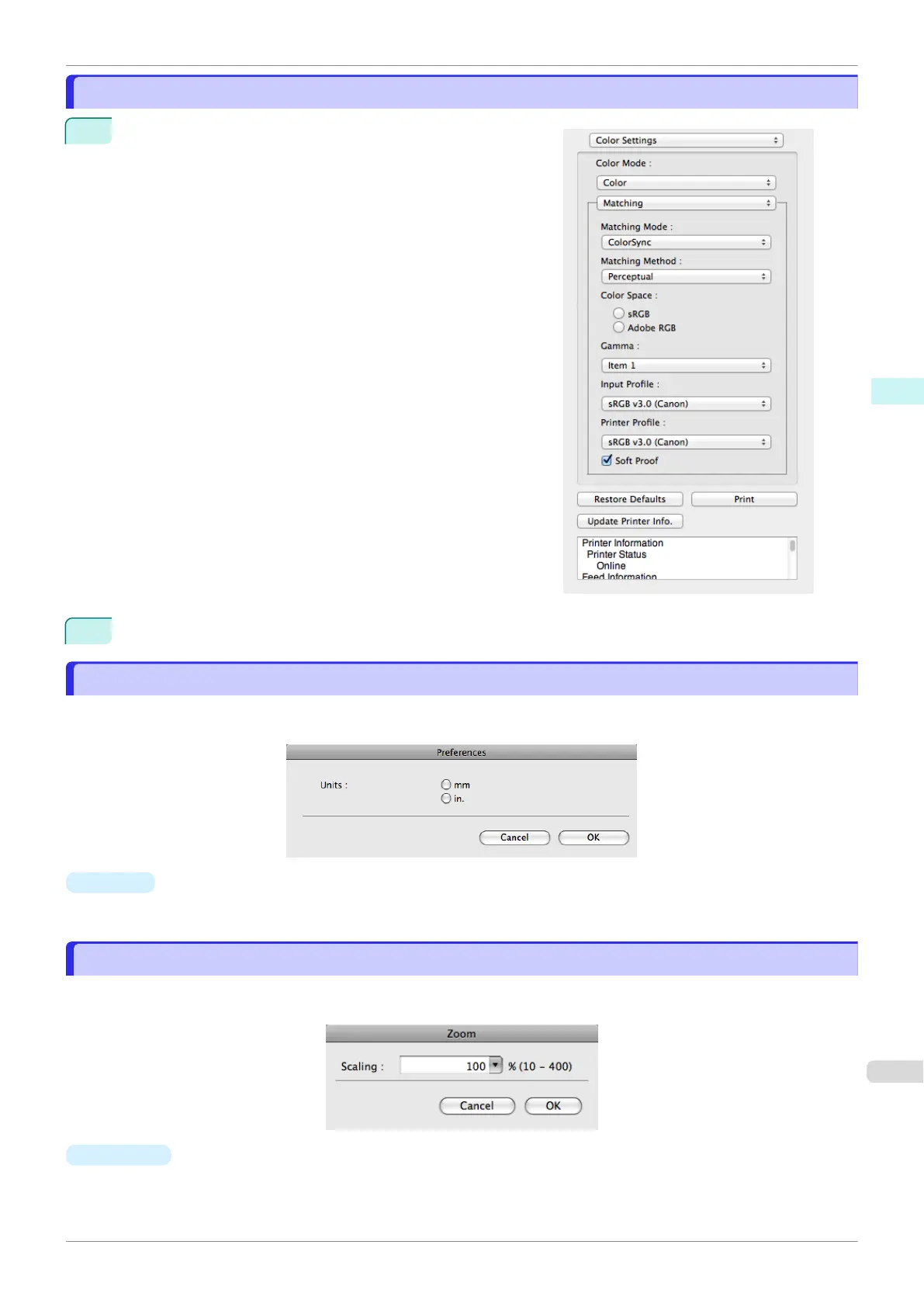 This dialog box appears when you select Preferences from the imagePROGRAF Advanced Preview menu. You