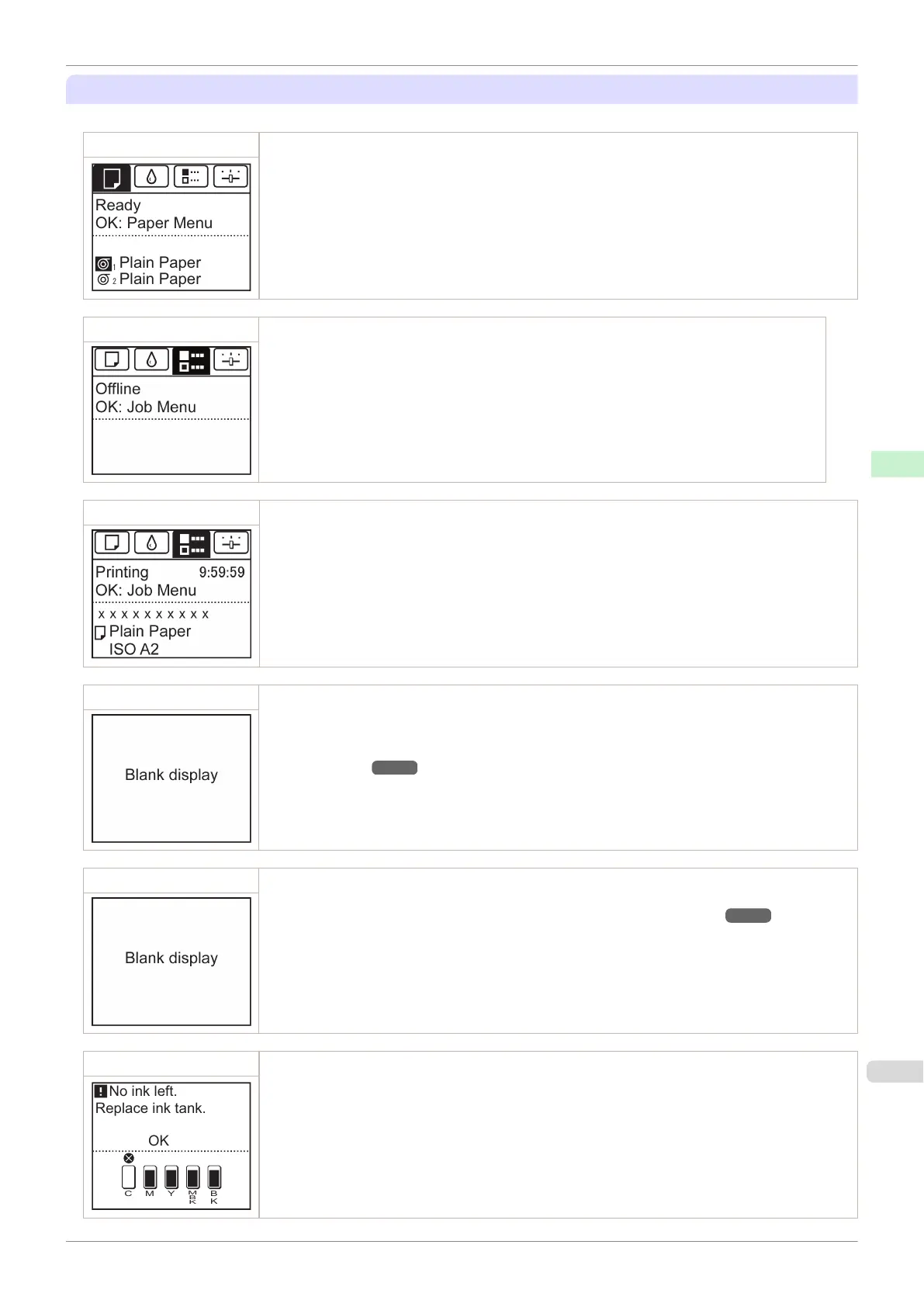 Standby The printer is ready to receive jobs sent from the computer. Jobs sent from the computer are printed