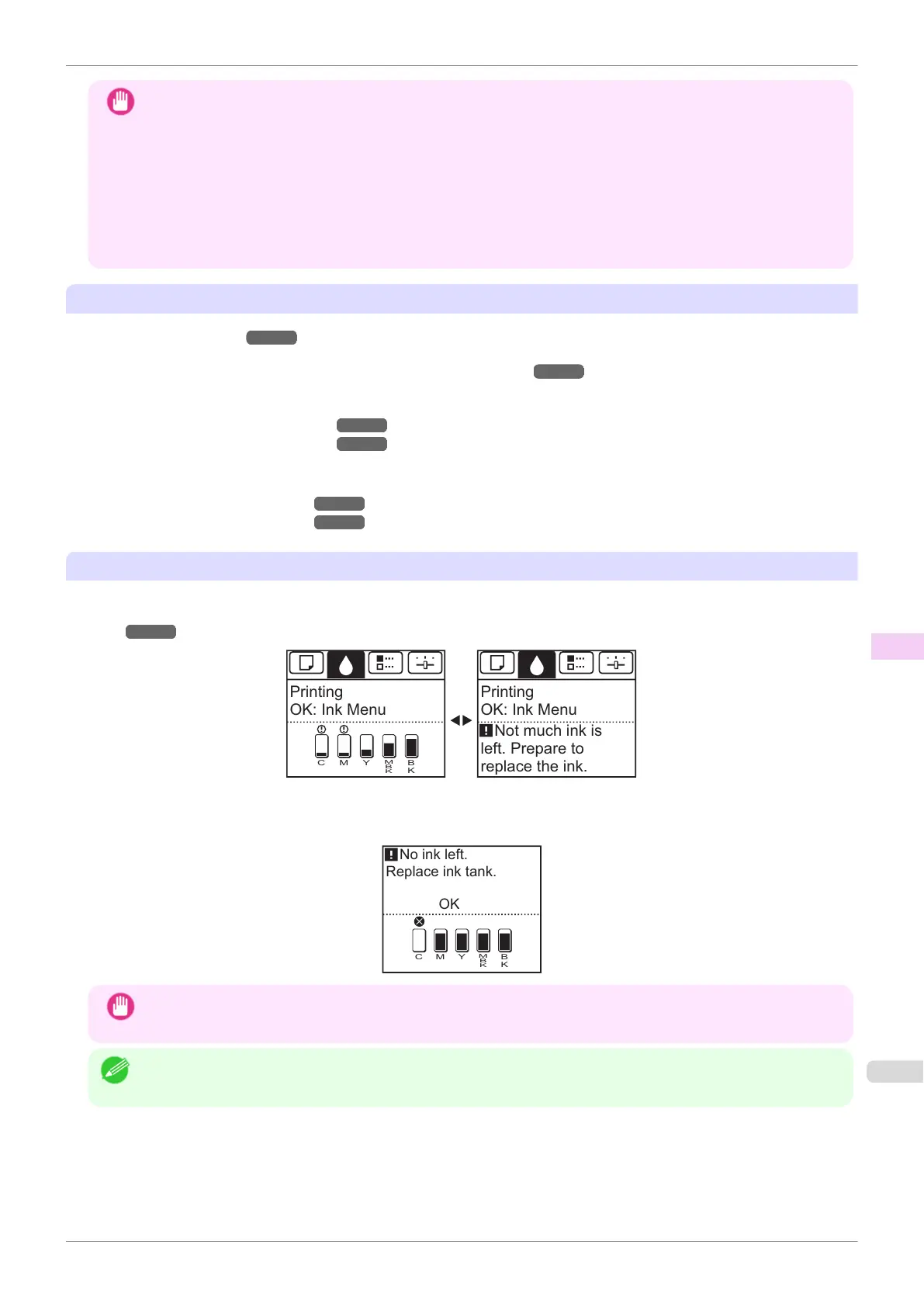 When the ink level becomes low, a message is displayed on the Display Screen.