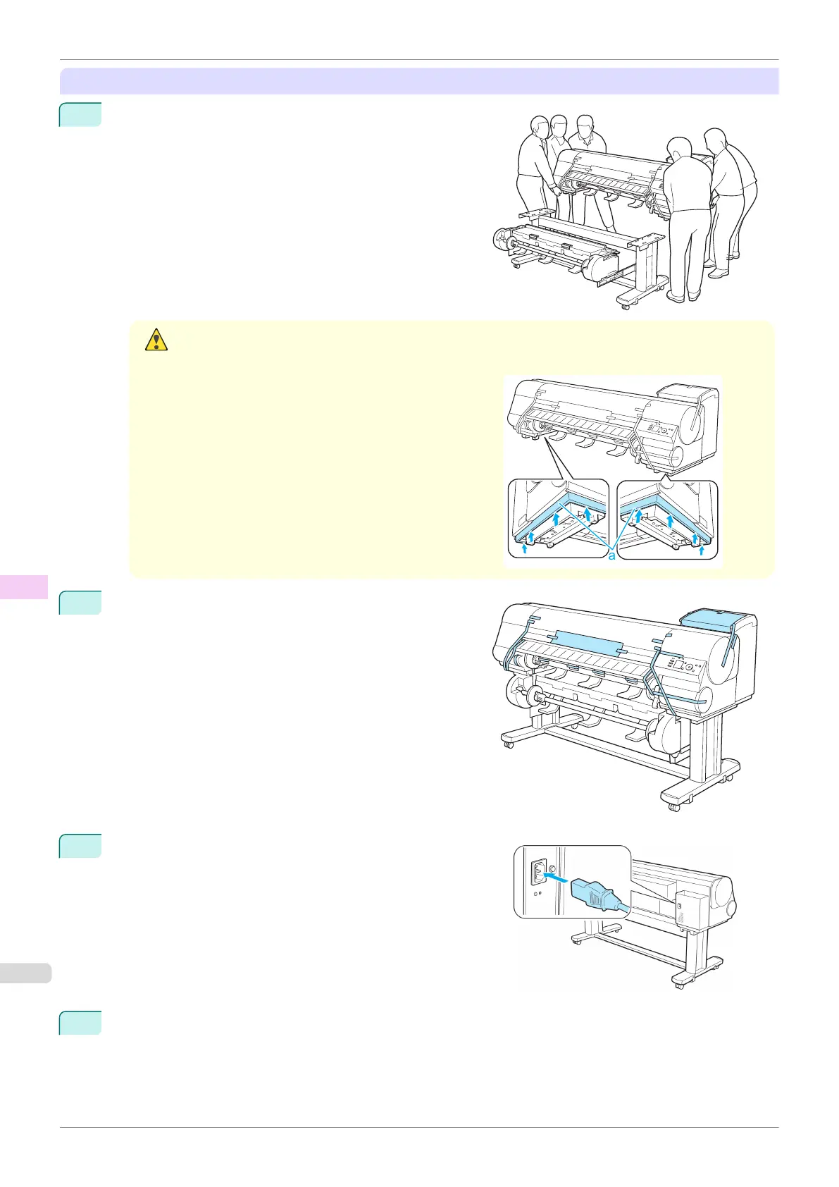Moving the printer requires at least six people, holding it on both sides. Be careful to avoid back strain
