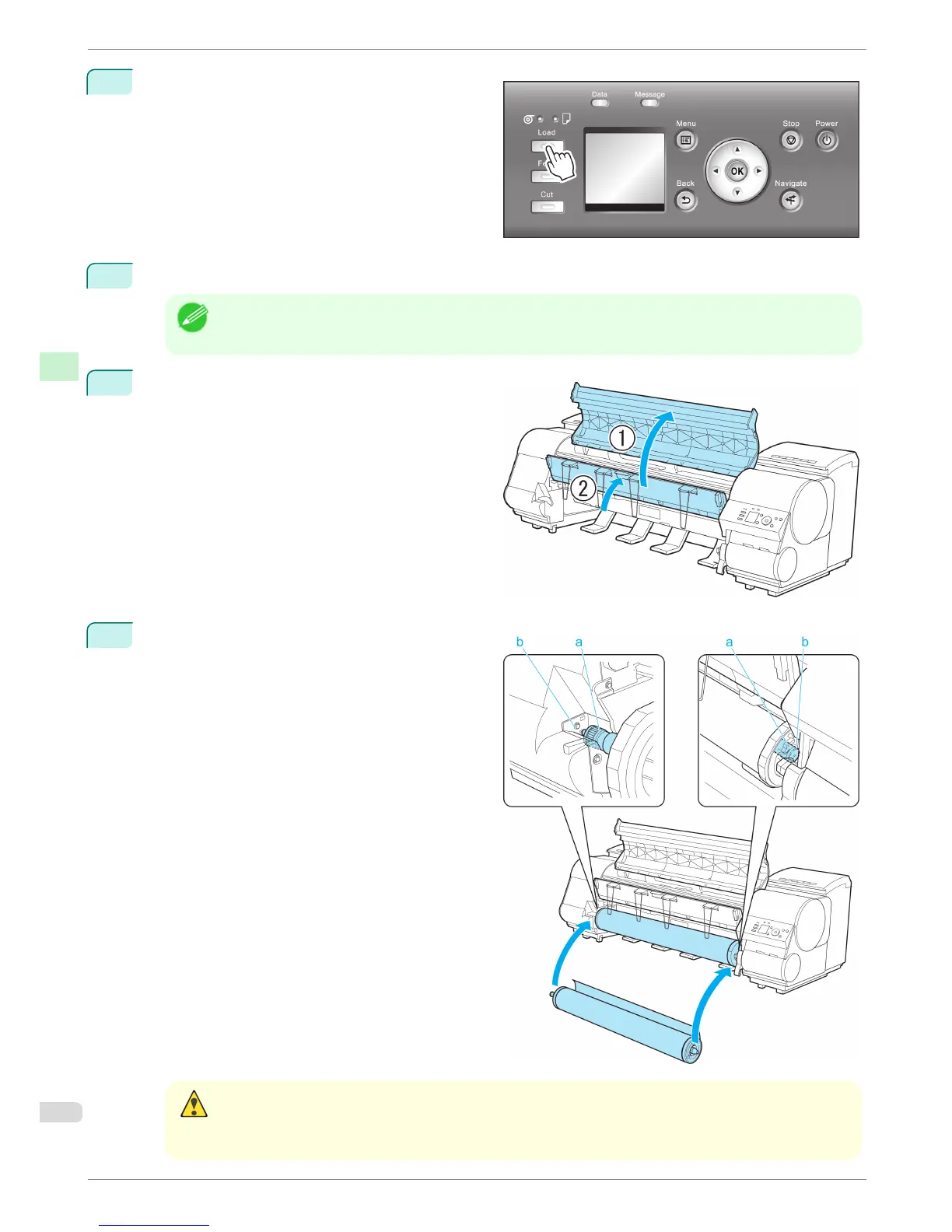 • Be careful not to pinch your fingers between the Roll Holder shaft (a) and the guide grooves (b) when loading