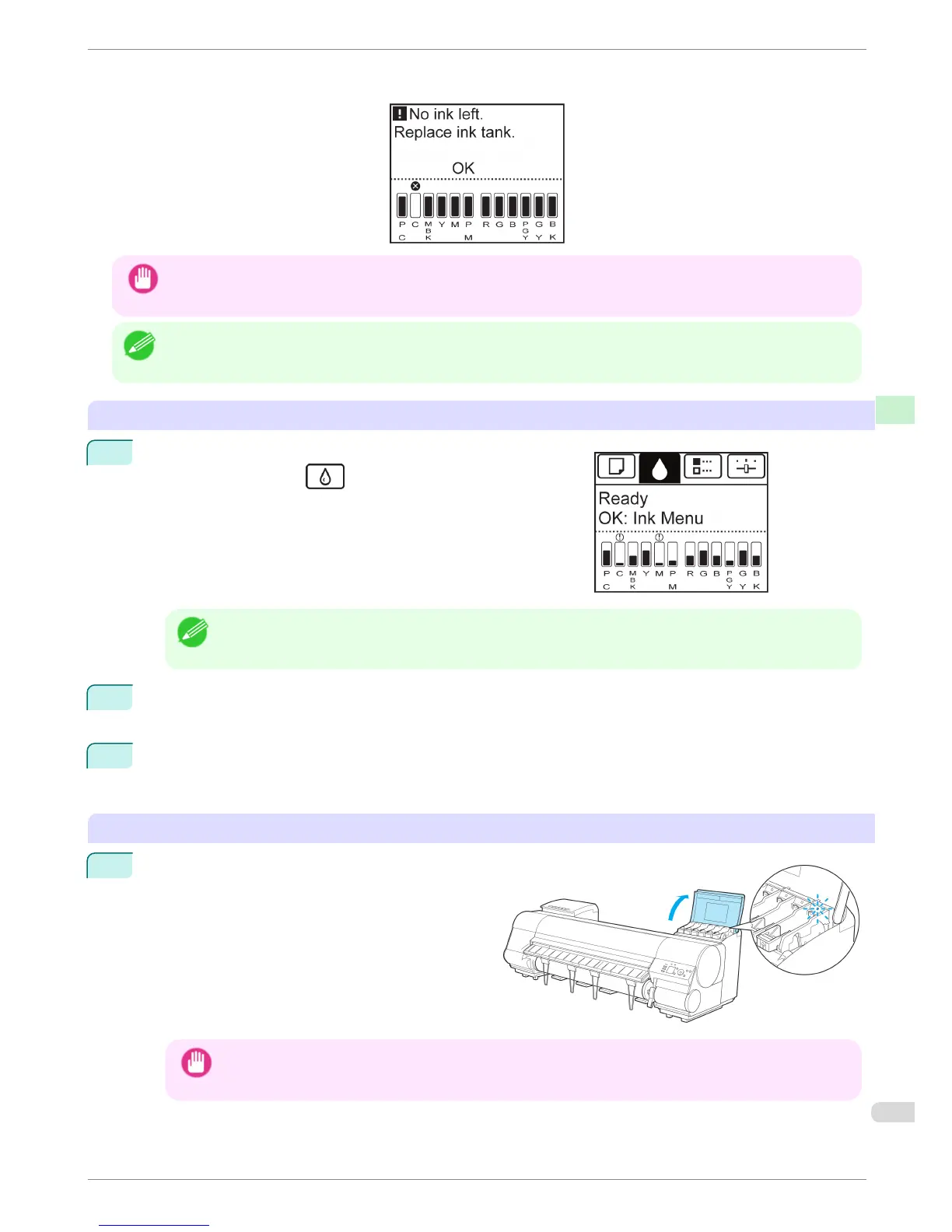 the menu for ink tank replacement. Follow the instructions in Remove the ink tanks.