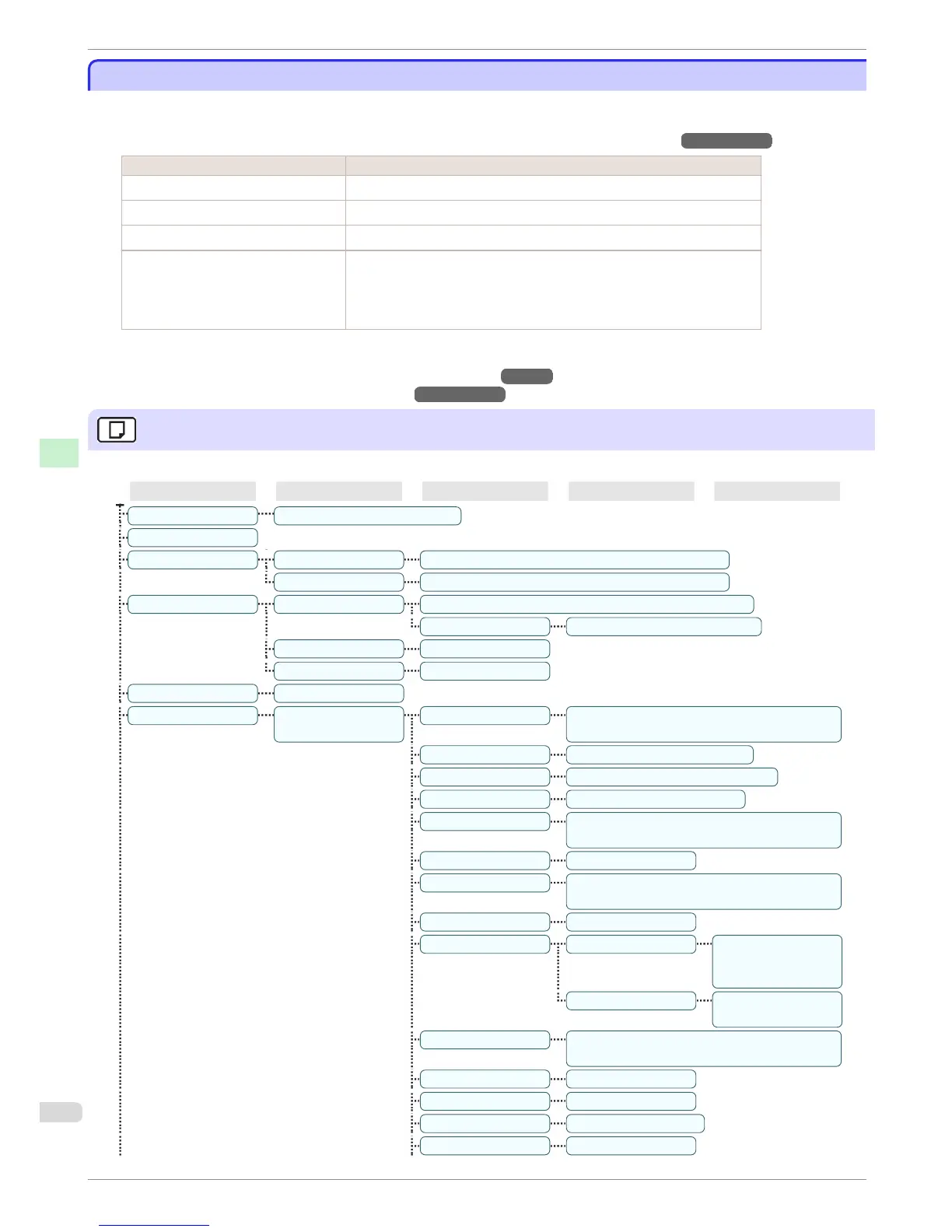 The printer menu is classified into regular menu items available when no print job is in progress and menu during
