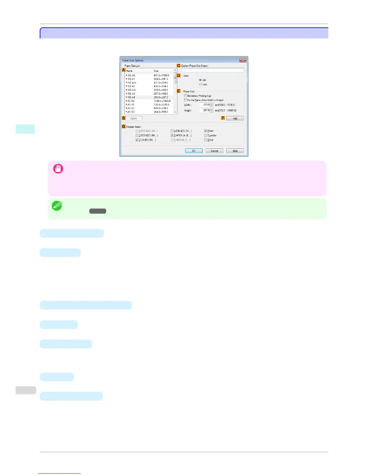 In the Paper Size Options dialog box, you can create and register your own Custom Paper Size. The sizes you