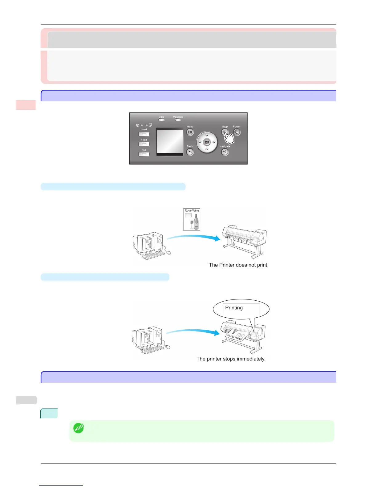 When you press the Stop button during printing, printer operation varies depending on the current status.