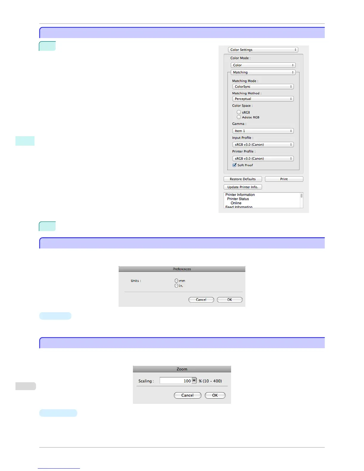 This dialog box appears when you select Preferences from the imagePROGRAF Advanced Preview menu. You