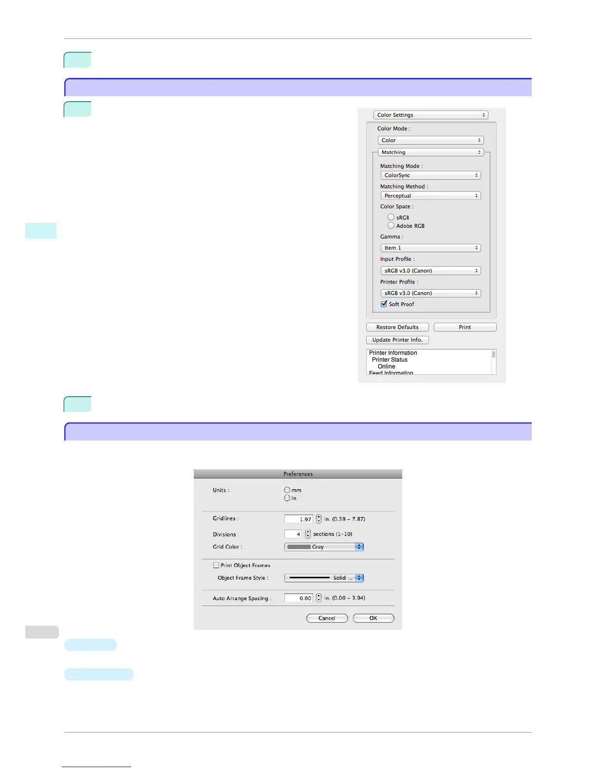 This dialog box appears when you select Preferences from the imagePROGRAF Advanced Preview menu. You
