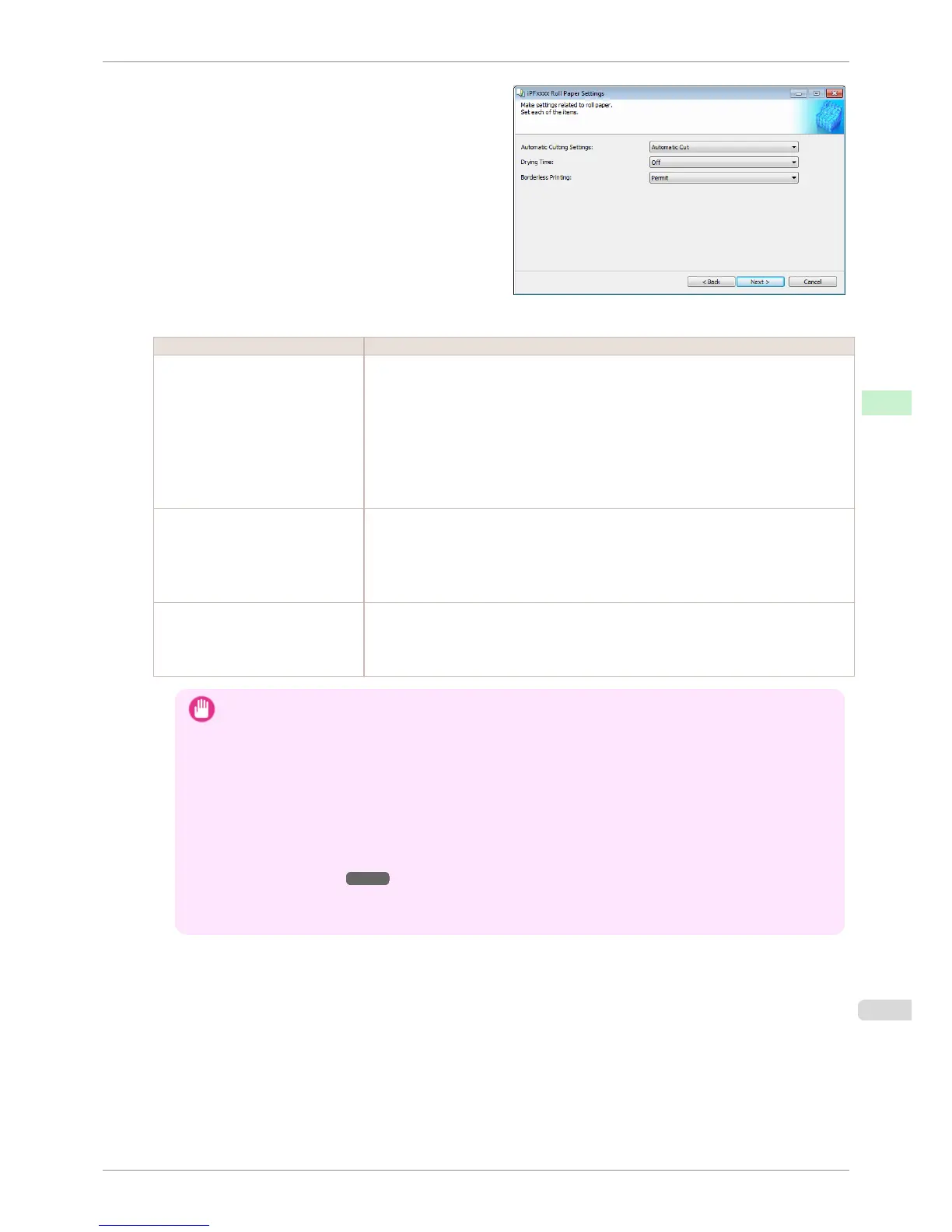 Automatic Cutting Settings Configures the method for cutting roll paper when it is ejected after printing.