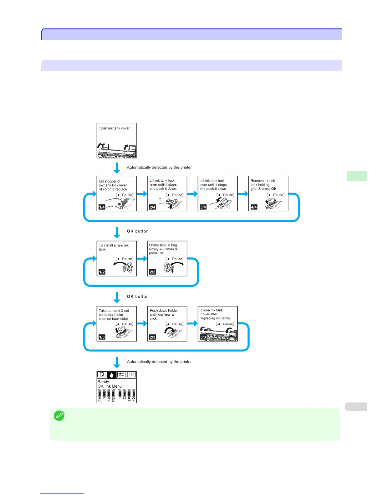 Once you complete an action described in the instructions, the printer detects the action and switches to the next
