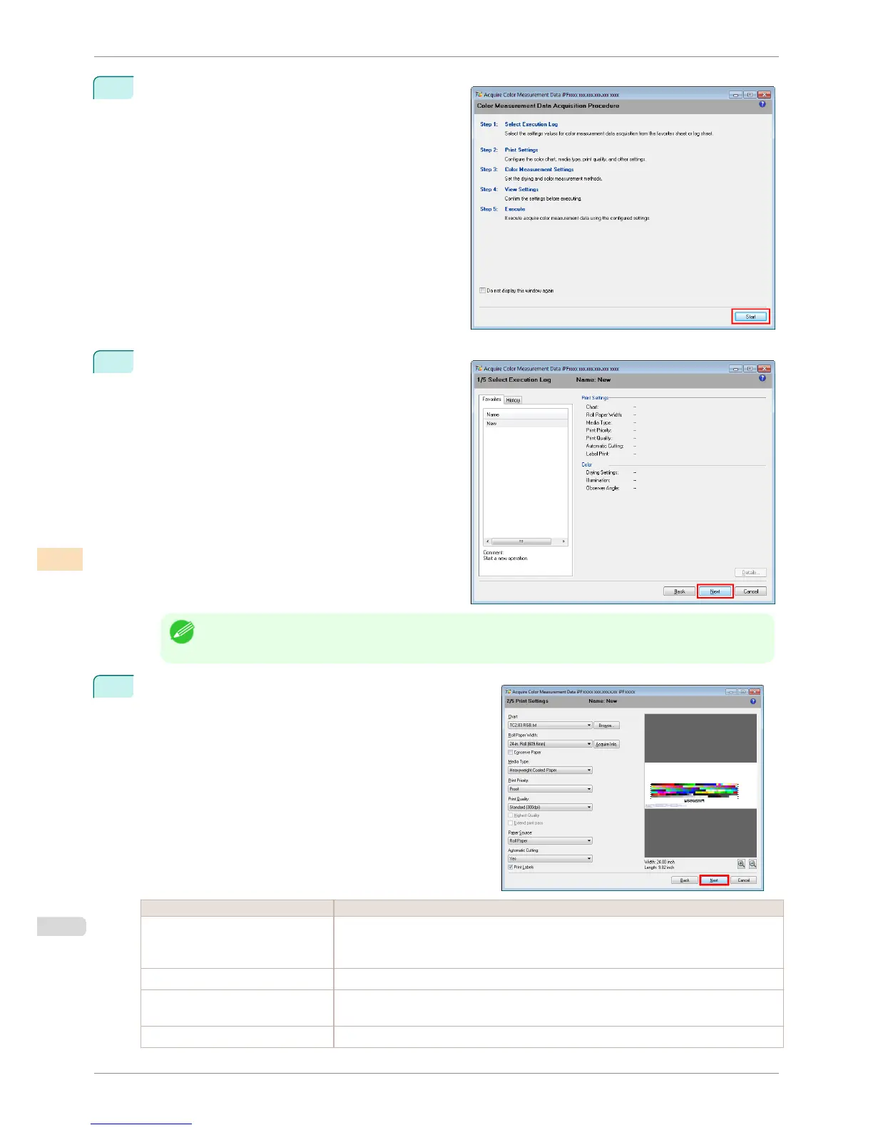 • To perform color chart measurement using the setting values when executed previously, select the execution
