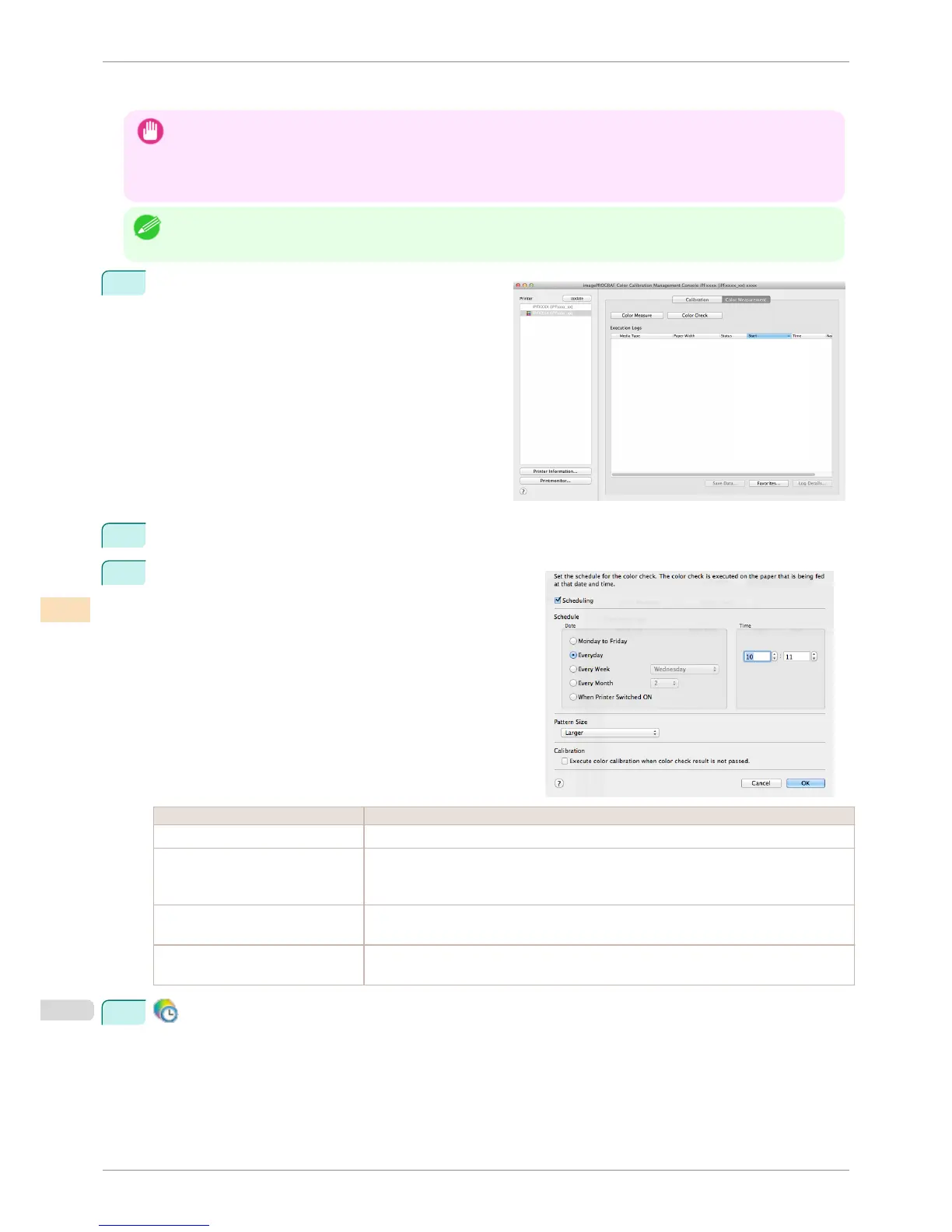 Scheduling Select this check box to execute a color check at the date and time specified in Schedule.