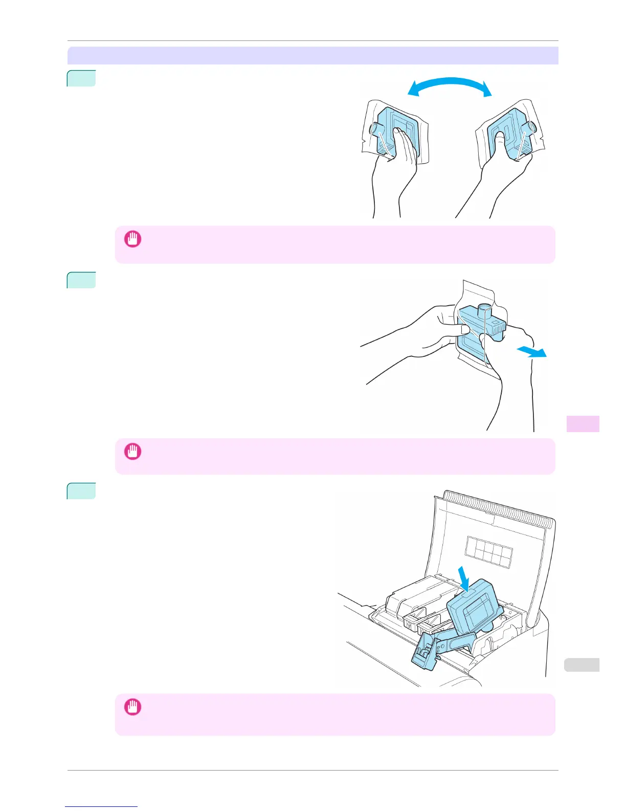 • Do not remove and agitate ink tanks that have already been installed in the printer. Ink may leak out.