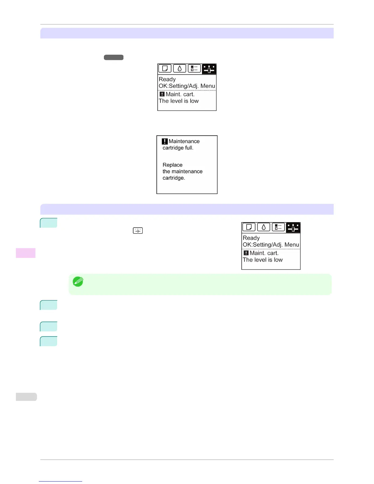 When the Maintenance Cartridge is almost empty, a message is shown on the Display Screen. According to the