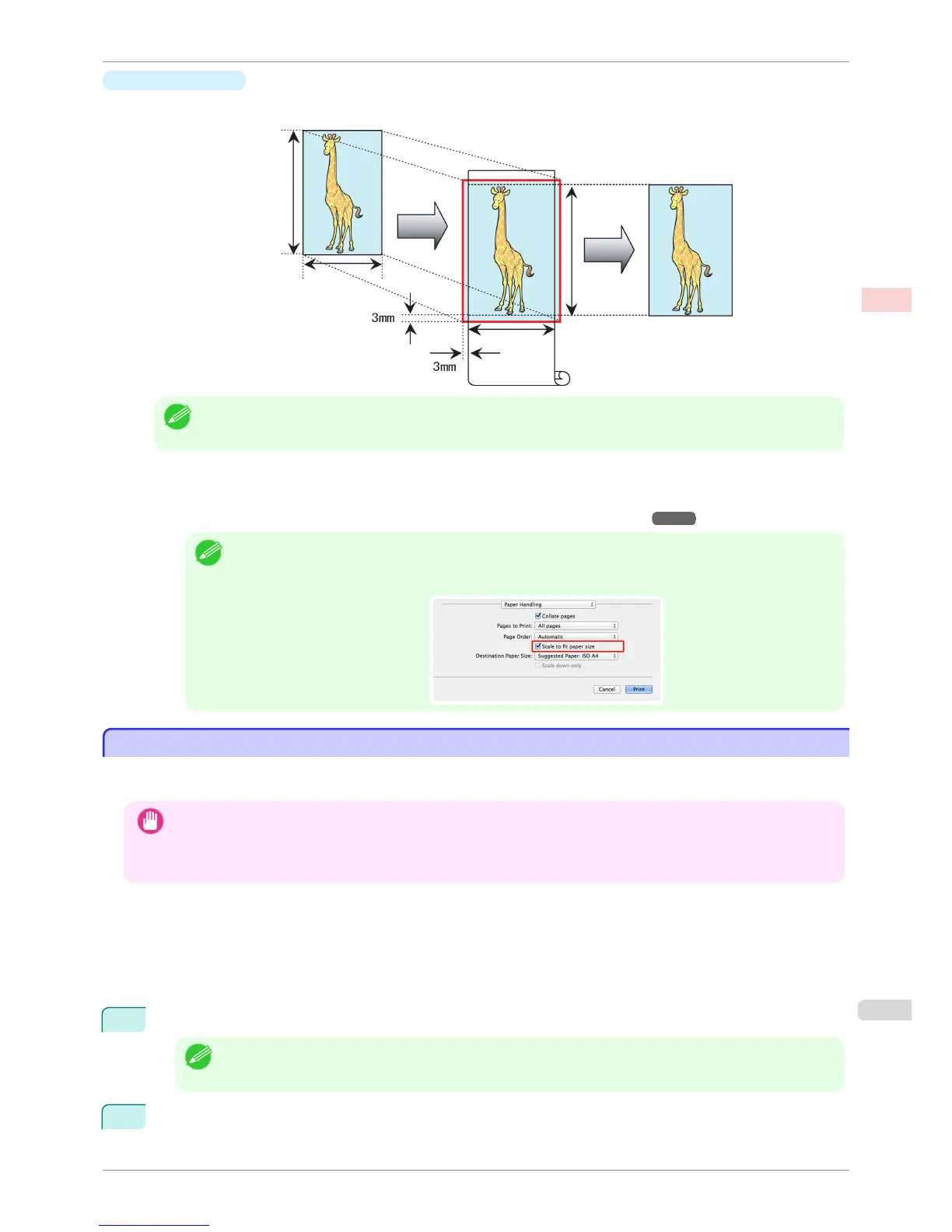 • To perform borderless printing with resizing to fit the paper size on Mac OS, select borderless in Paper Size