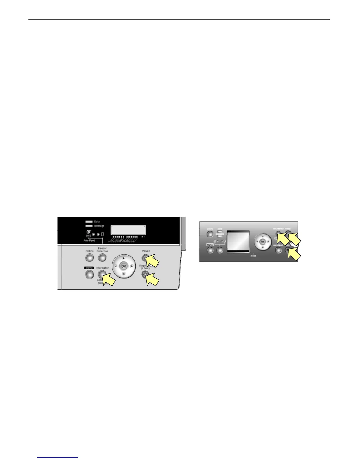 Model without [Navigate] button: Switch on the printer while pressing the [Stop] button and the [Information] button