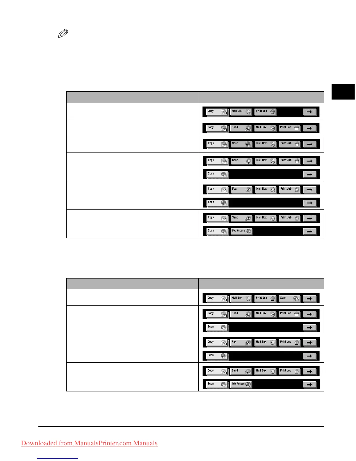 The following table indicates the various combination of function keys displayed on the touch panel