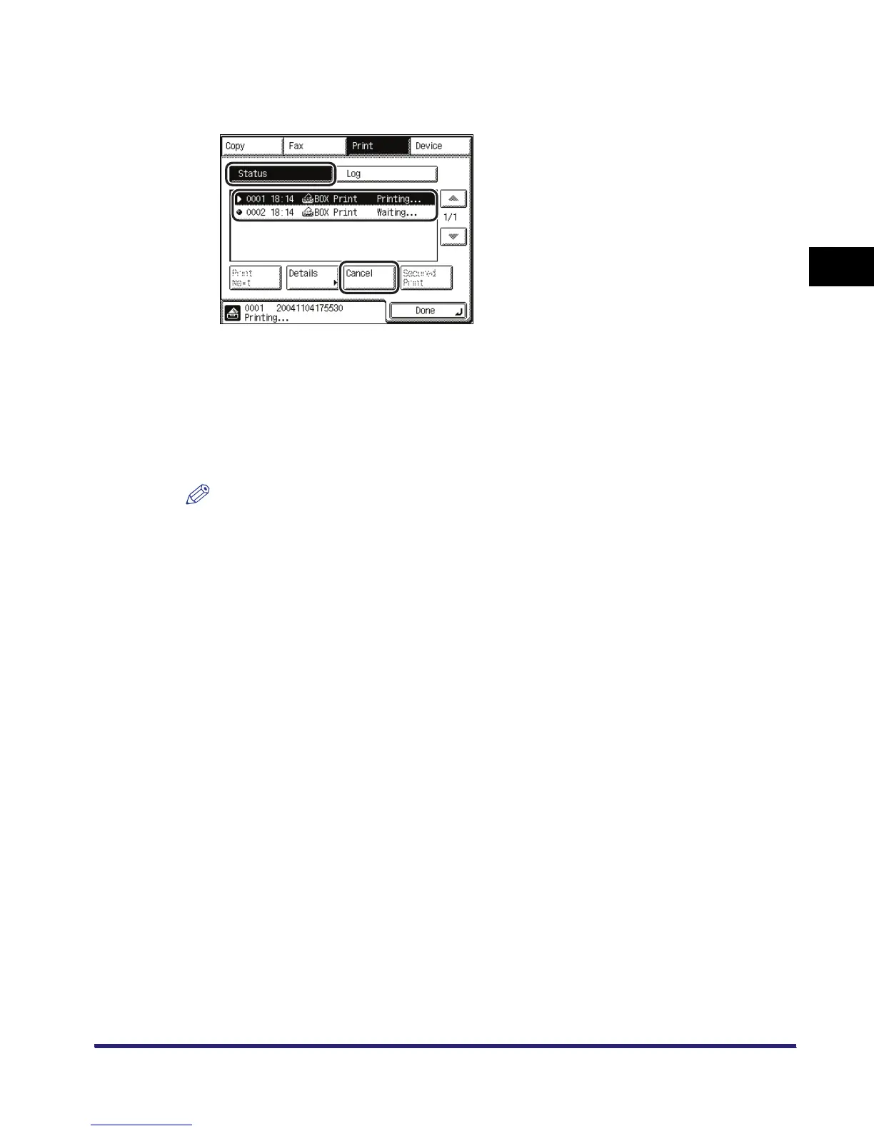 Press [Status] ➞ select the print job that you want to cancel ➞ press