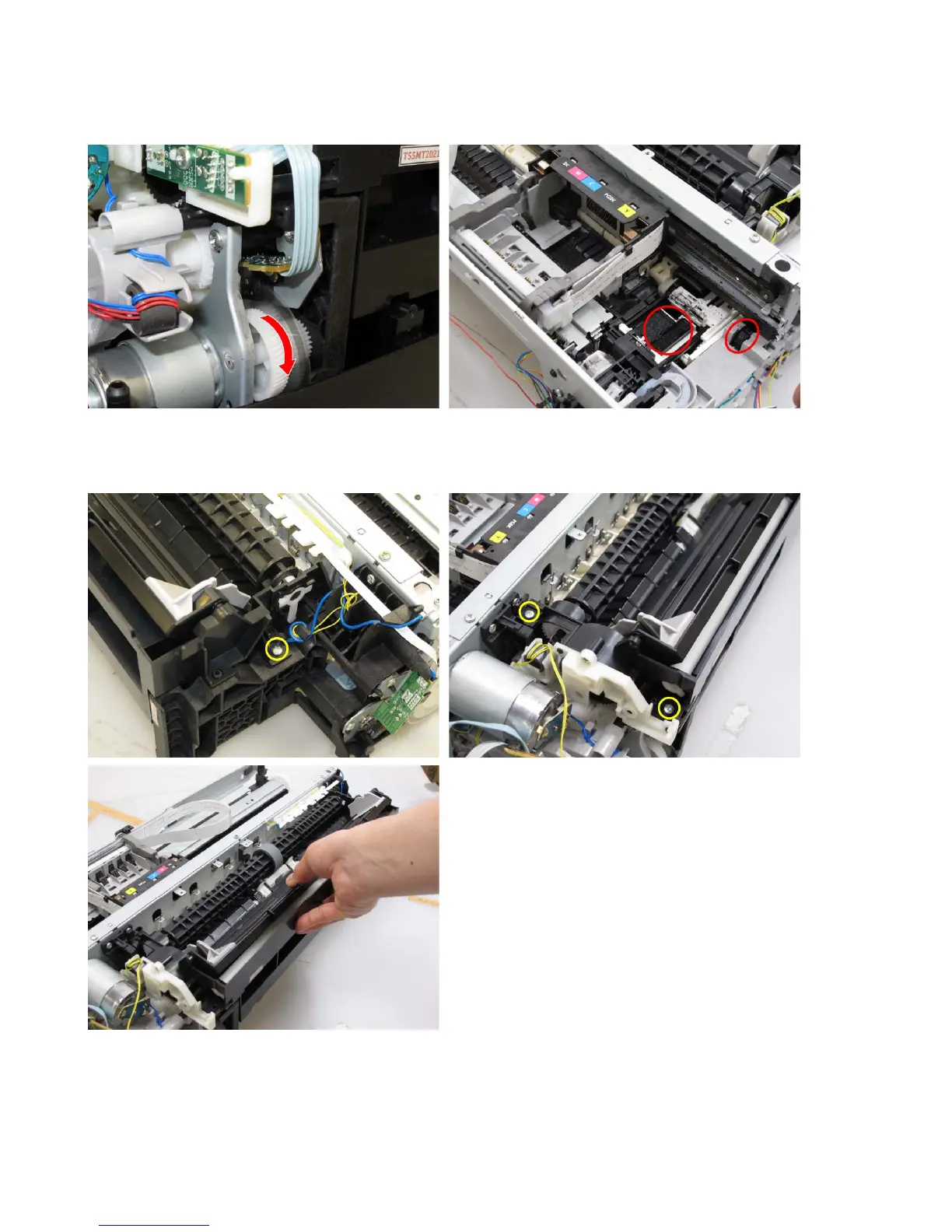 1) Rotate the drive unit gear toward the back of the printer to unlock the carriage.