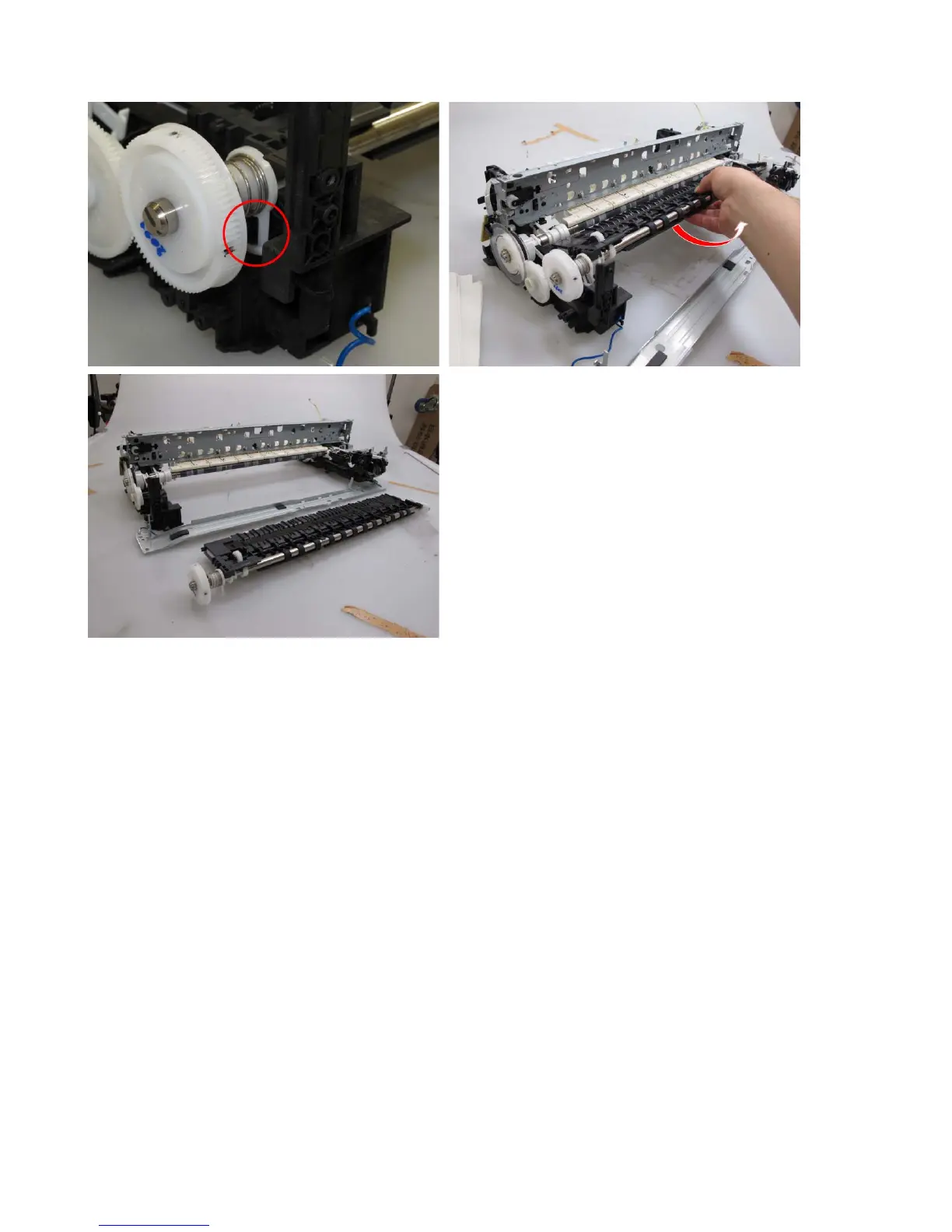 4) Unlock the paper eject roller gear. While raising the front of the platen unit, remove the platen