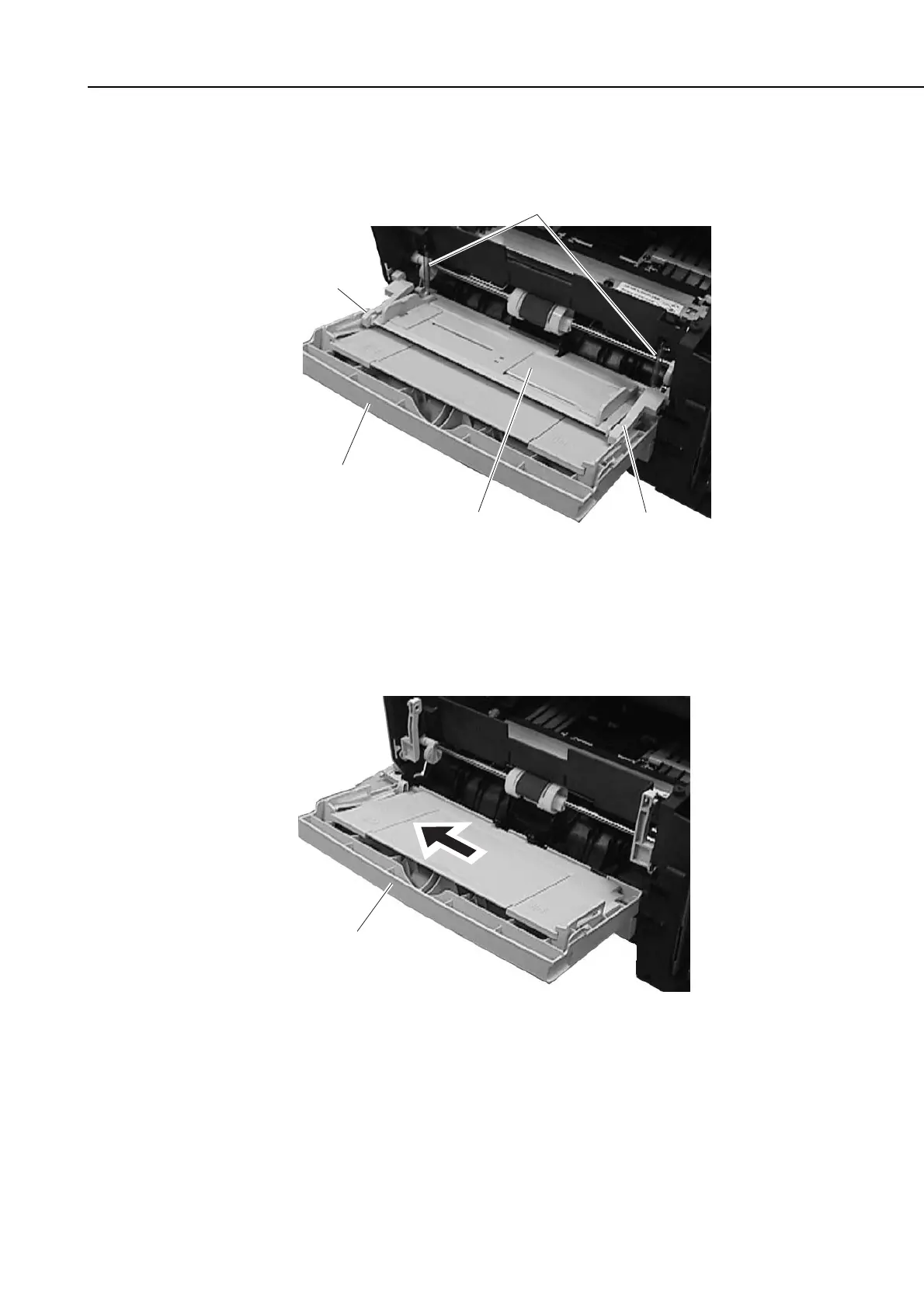 (13) Remove the 2 springs from the machine side; then, detach the multi-purpose tray