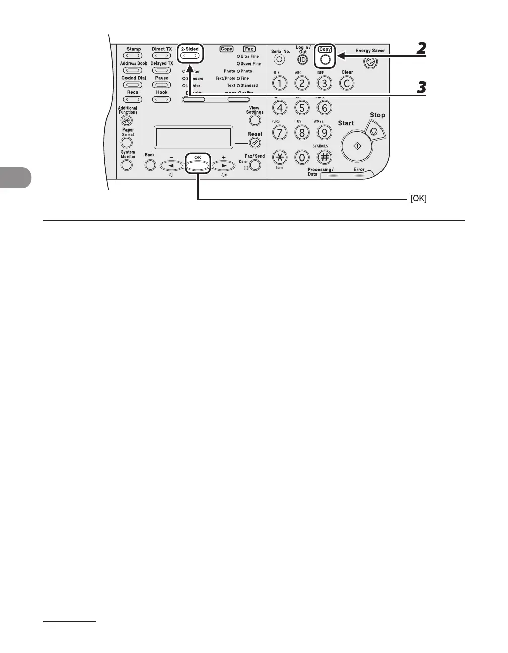 3 Press [2-sided] repeatedly to select <1 > 2-SIDED>, then press [OK].